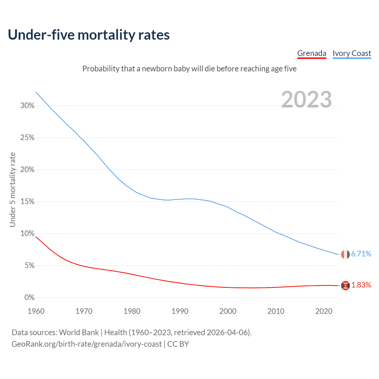 The chance that a newborn baby will die before reaching age five is 1.83% in Grenada and 6.71% in Ivory Coast. Above is a chart with historical data on under-five mortality rates.