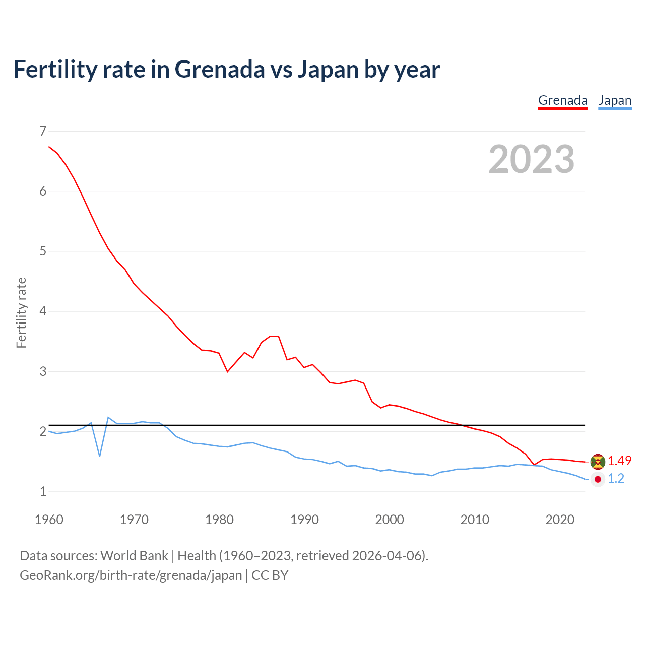1960 vs 2023, the fertility rate has decreased by 77.9% in Grenada and by 40% in Japan — in 1960, it was 6.74 and 2, respectively.