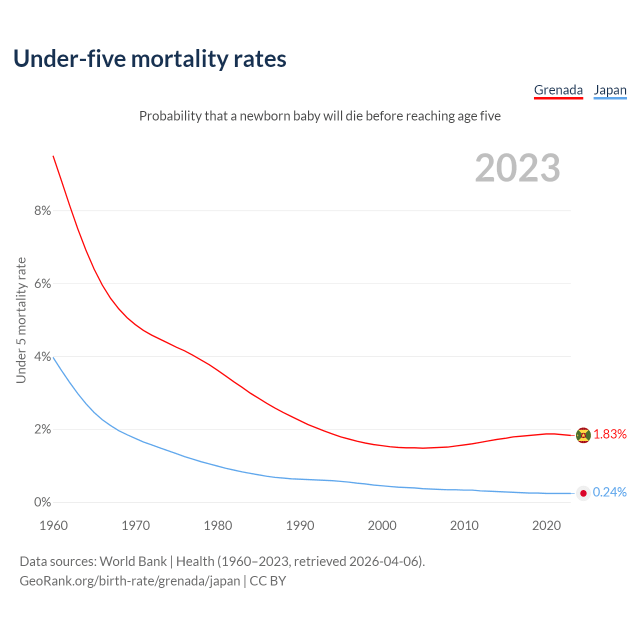The chance that a newborn baby will die before reaching age five is 1.83% in Grenada and 0.24% in Japan. Above is a chart with historical data on under-five mortality rates.