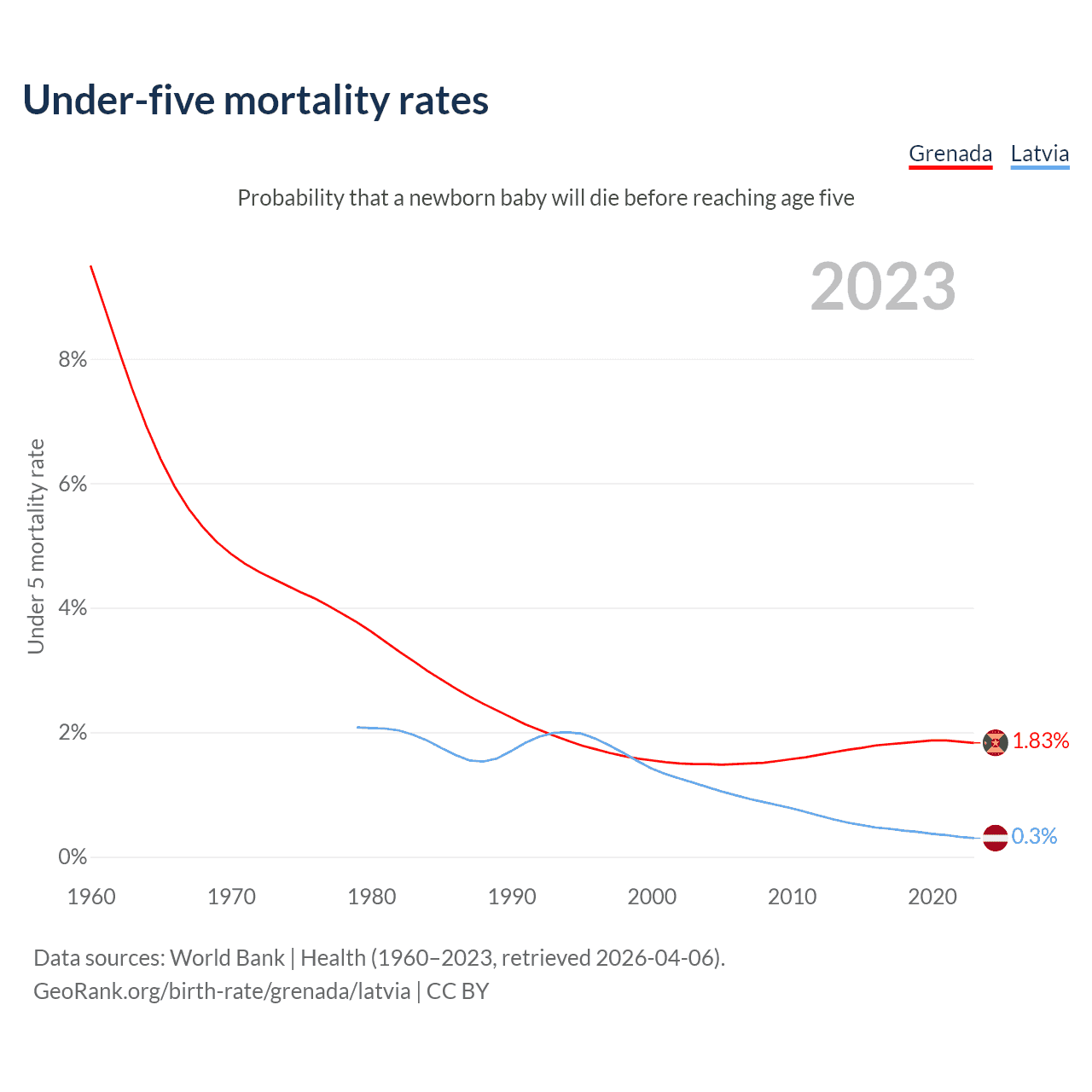 The chance that a newborn baby will die before reaching age five is 1.83% in Grenada and 0.3% in Latvia. Above is a chart with historical data on under-five mortality rates.