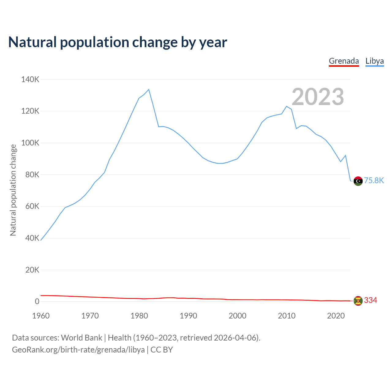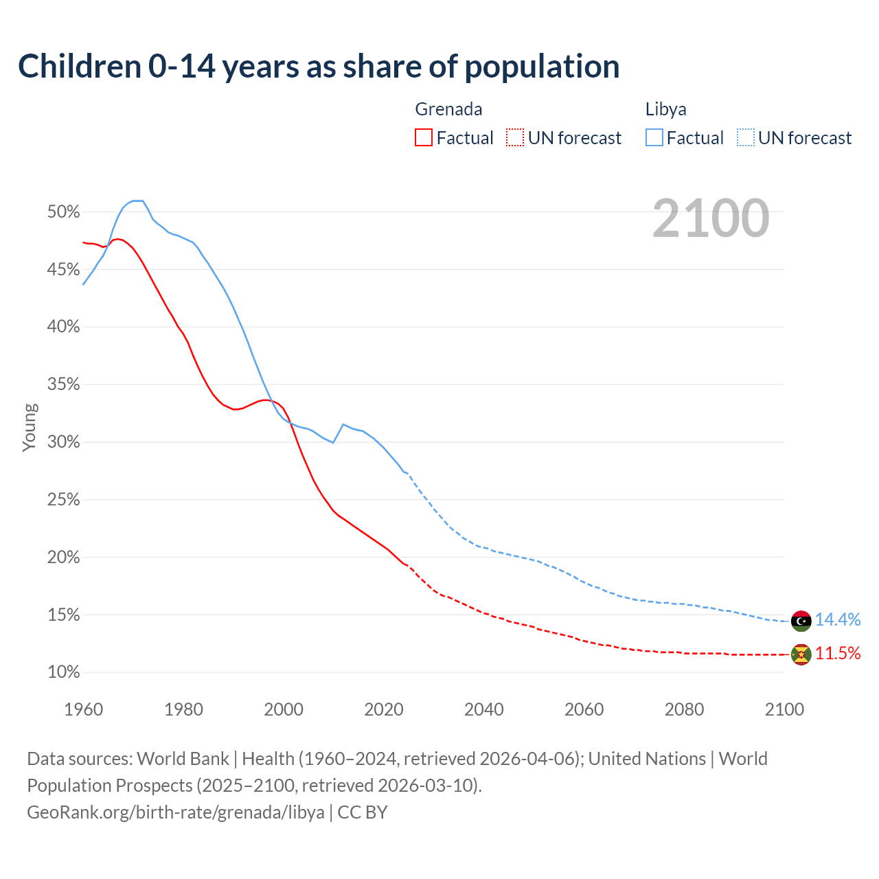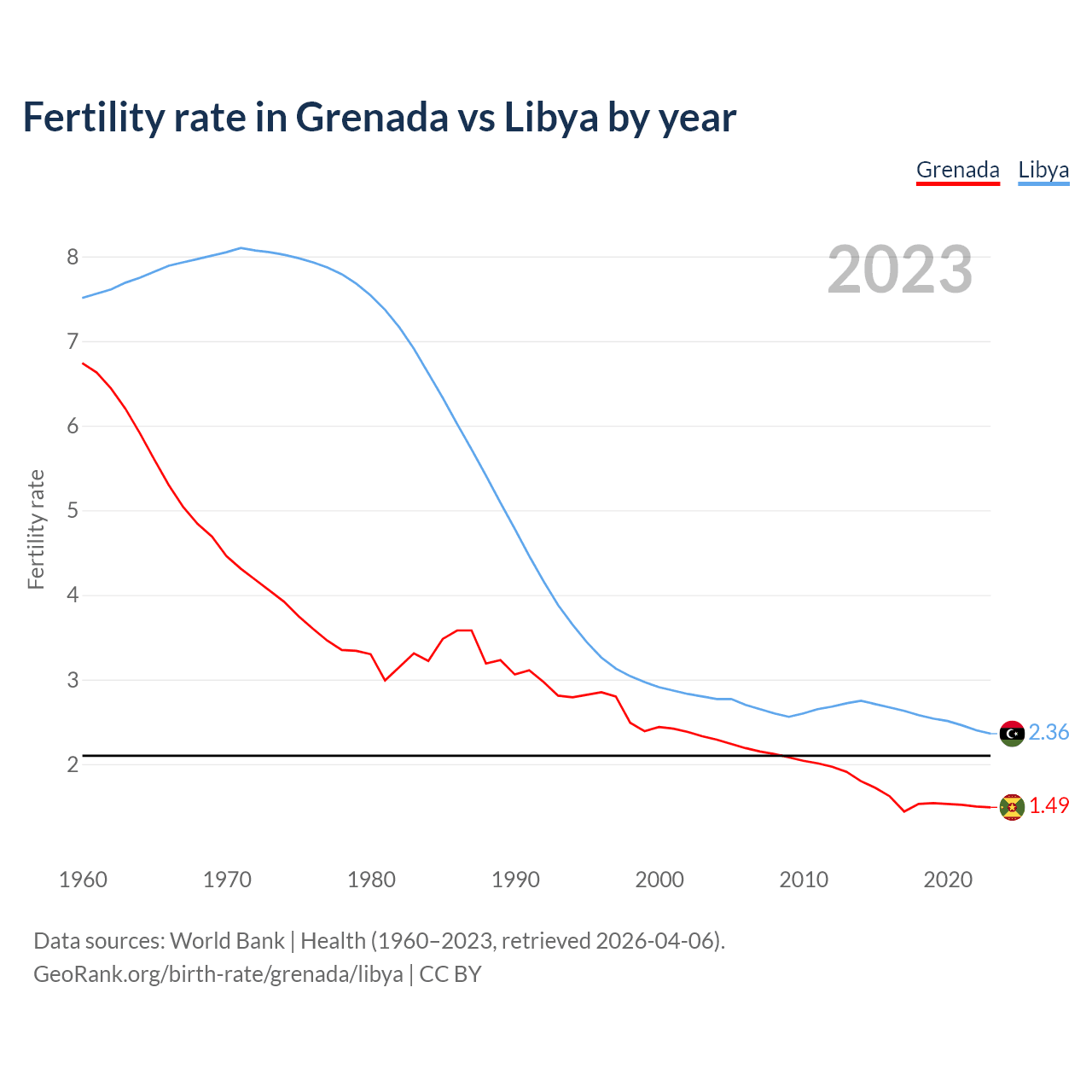 According to the latest available data on birth rates, the fertility rate in Grenada was 1.49 children per woman in 2023, compared to 2.36 in Libya in 2023. The replacement level is considered to be 2.1 children per woman.