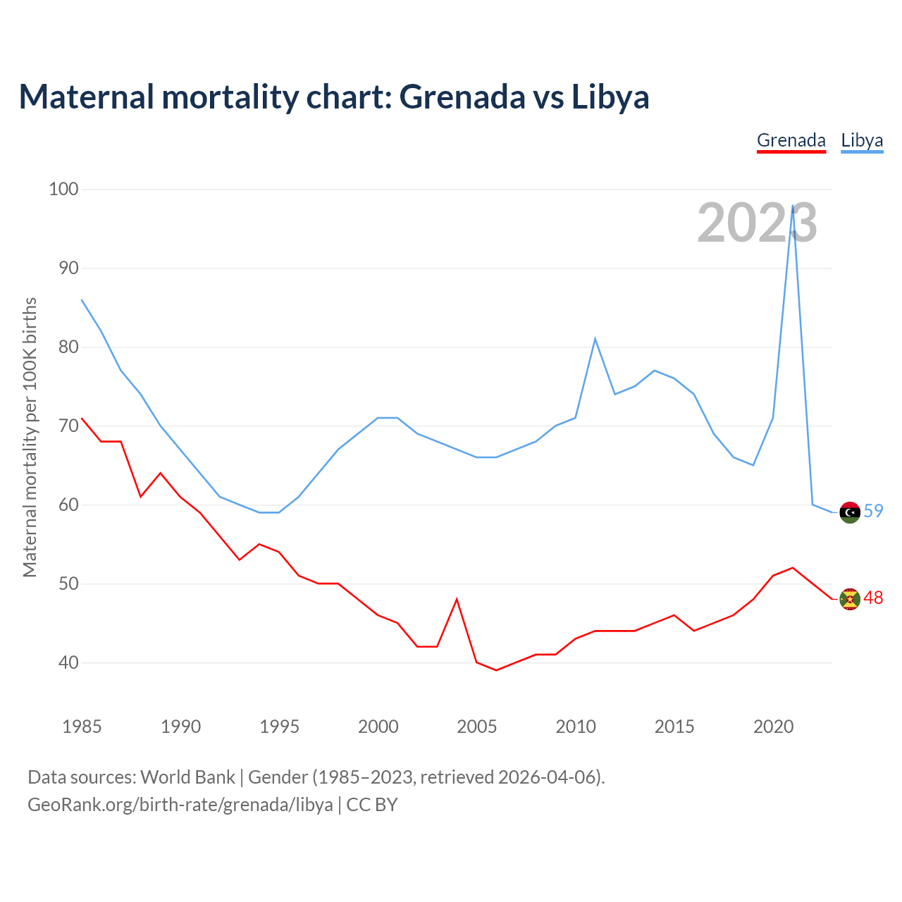 The maternal mortality rate, which is the probability of dying during childbirth or within 42 days of pregnancy termination, is 48 deaths per 100,000 live births in Grenada, compared to 59 deaths in Libya.