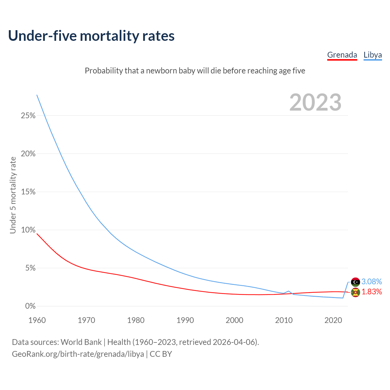 The chance that a newborn baby will die before reaching age five is 1.83% in Grenada and 3.08% in Libya. Above is a chart with historical data on under-five mortality rates.