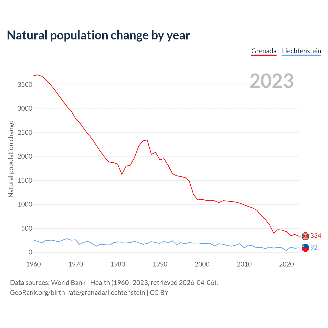 According to the latest available data on birth rates, the fertility rate in Grenada was 1.49 children per woman in 2023, compared to 1.45 in Liechtenstein in 2023. The replacement level is considered to be 2.1 children per woman.