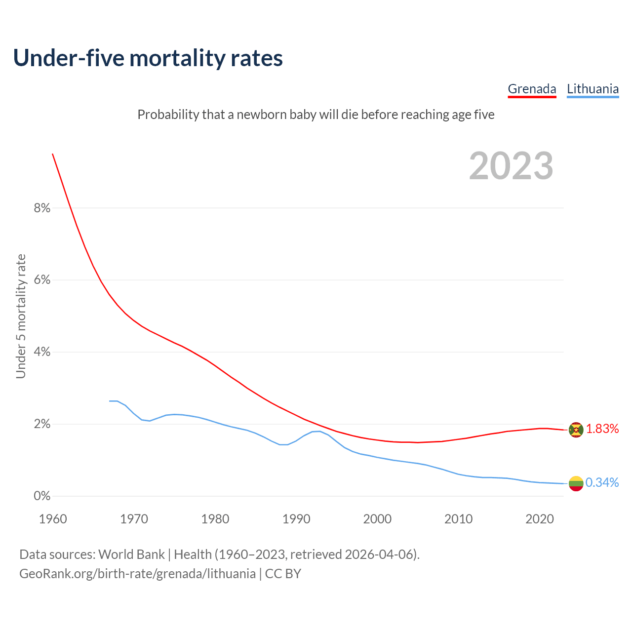 The chance that a newborn baby will die before reaching age five is 1.83% in Grenada and 0.34% in Lithuania. Above is a chart with historical data on under-five mortality rates.