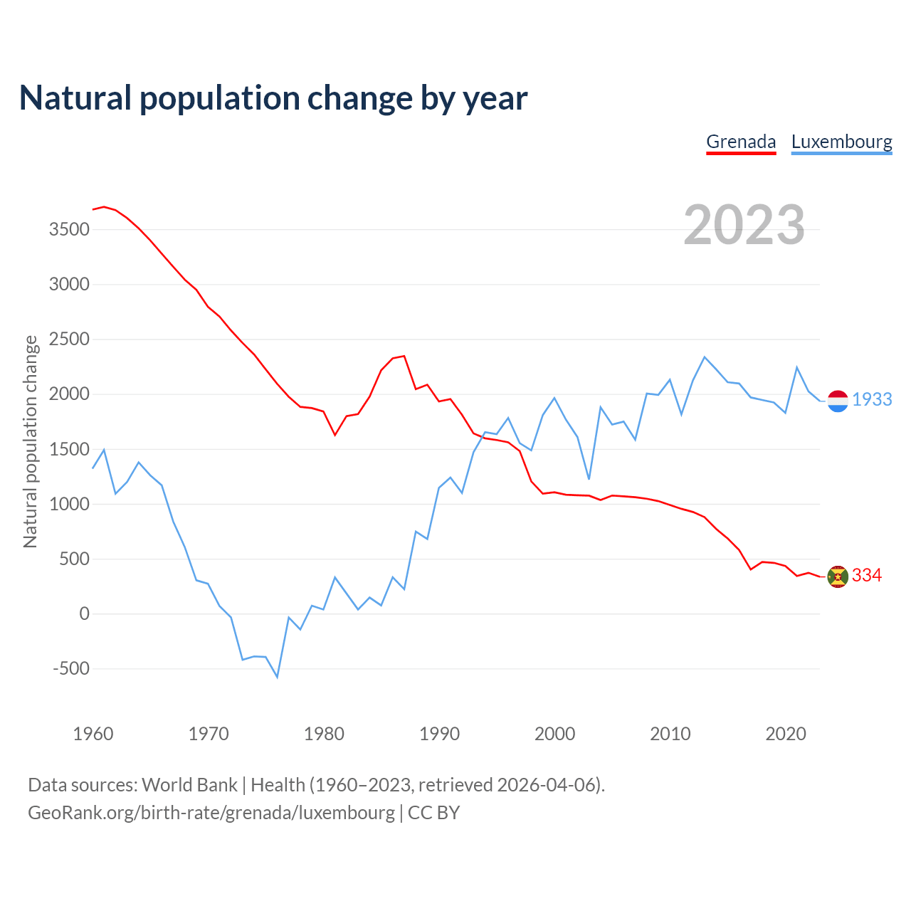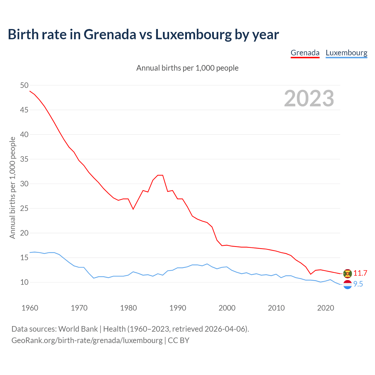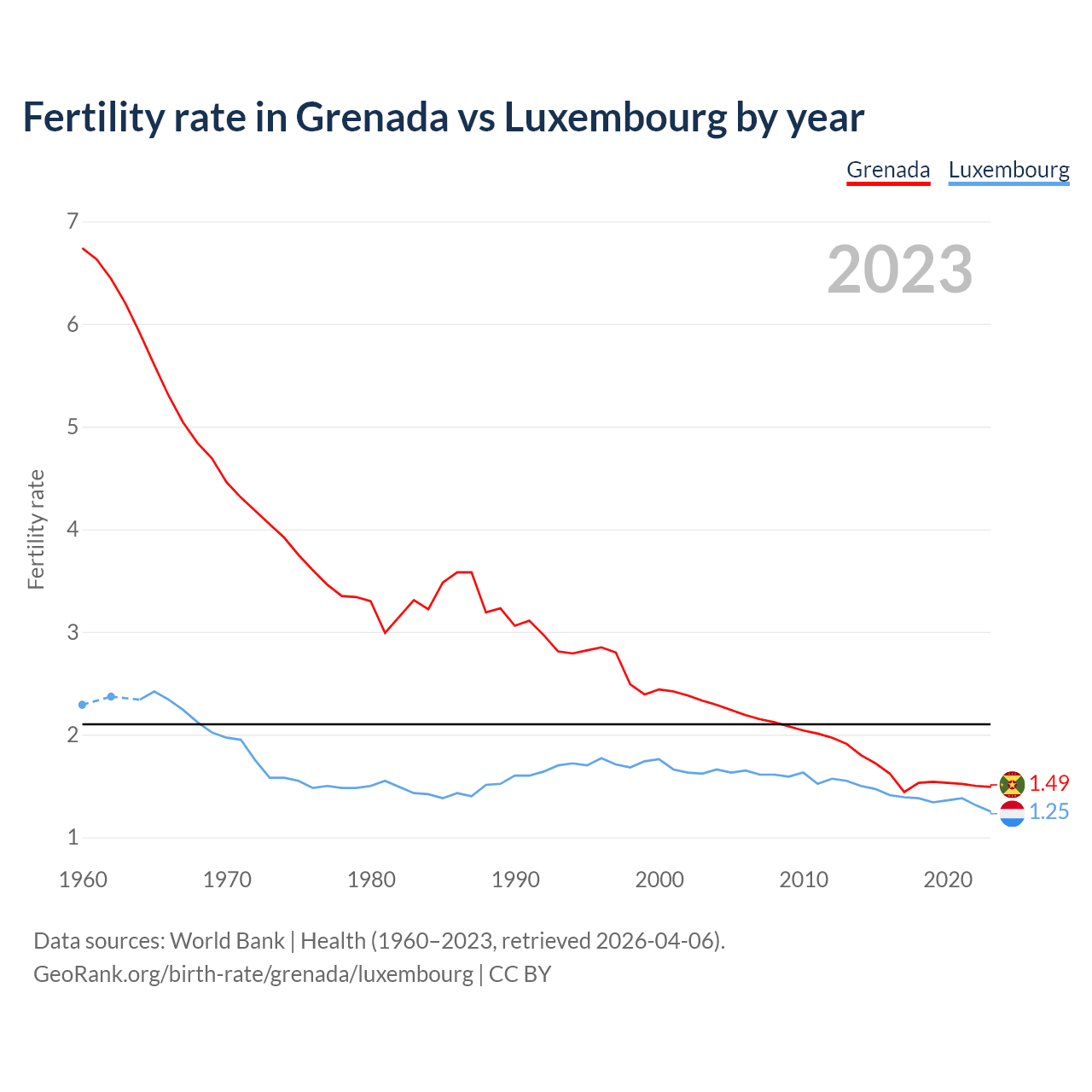 According to the latest available data on birth rates, the fertility rate in Grenada was 1.49 children per woman in 2023, compared to 1.25 in Luxembourg in 2023. The replacement level is considered to be 2.1 children per woman.