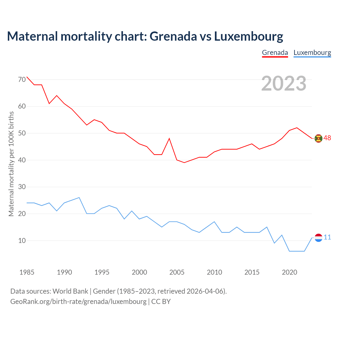 The maternal mortality rate, which is the probability of dying during childbirth or within 42 days of pregnancy termination, is 48 deaths per 100,000 live births in Grenada, compared to 11 deaths in Luxembourg.