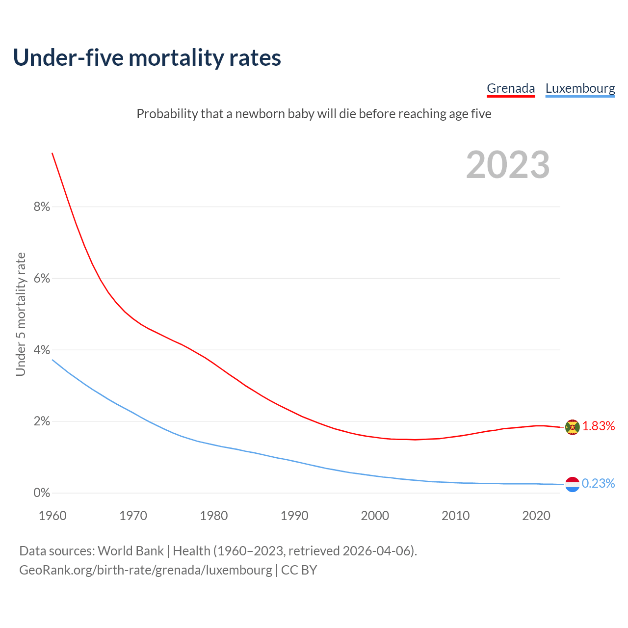 The chance that a newborn baby will die before reaching age five is 1.83% in Grenada and 0.23% in Luxembourg. Above is a chart with historical data on under-five mortality rates.