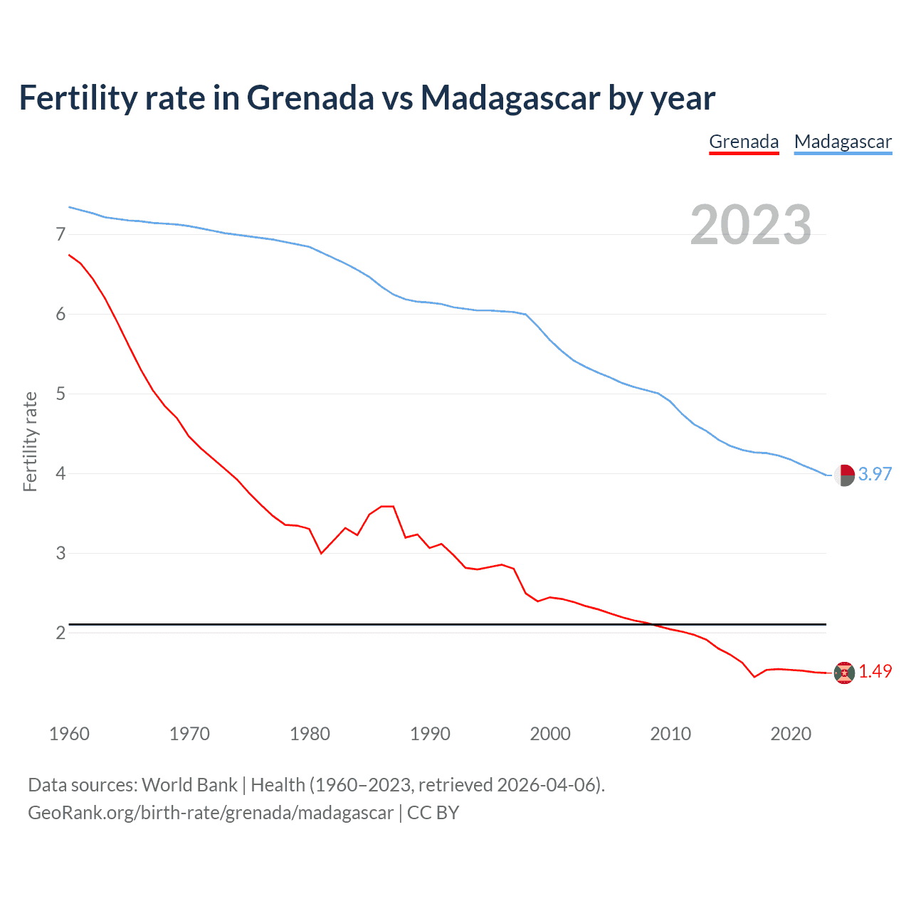 1960 vs 2023, the fertility rate has decreased by 77.9% in Grenada and by 45.9% in Madagascar — in 1960, it was 6.74 and 7.34, respectively.