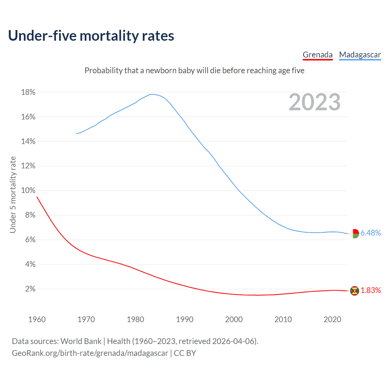 The chance that a newborn baby will die before reaching age five is 1.83% in Grenada and 6.48% in Madagascar. Above is a chart with historical data on under-five mortality rates.