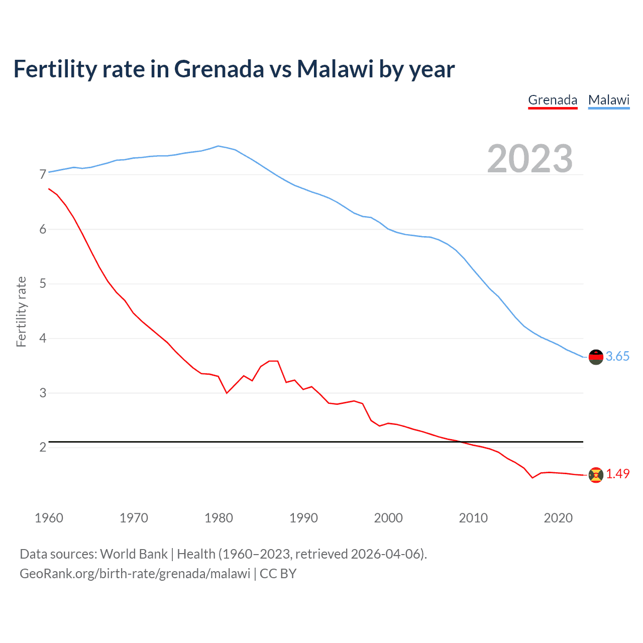 According to the latest available data on birth rates, the fertility rate in Grenada was 1.49 children per woman in 2023, compared to 3.65 in Malawi in 2023. The replacement level is considered to be 2.1 children per woman.