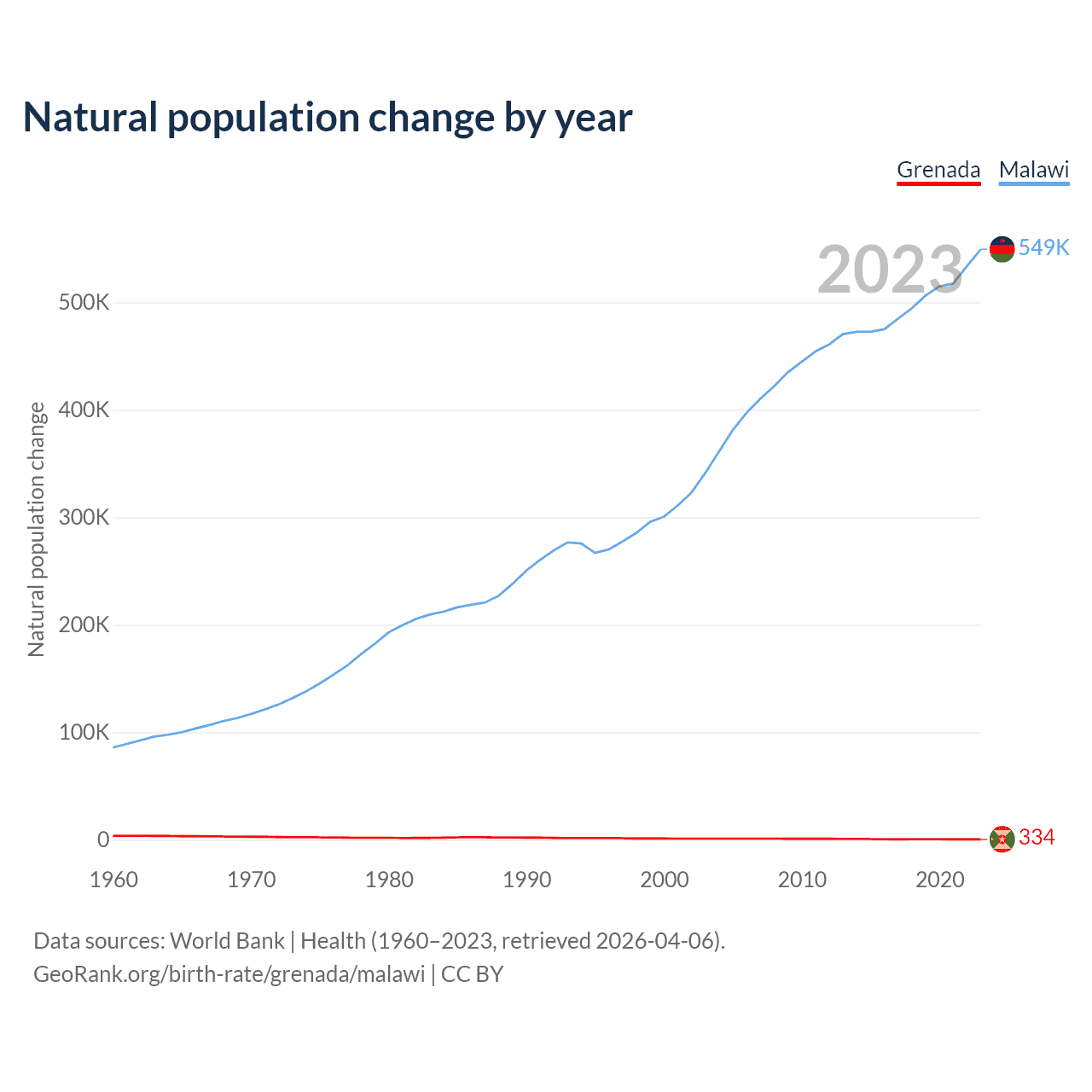 Grenada has an annual birth rate of 11.7 births per 1,000 people, compared to 31.4 for Malawi. The average number of children a woman is expected to have during her lifetime — the fertility rate, is 1.49 in Grenada and 3.65 in Malawi — 145.3% difference.