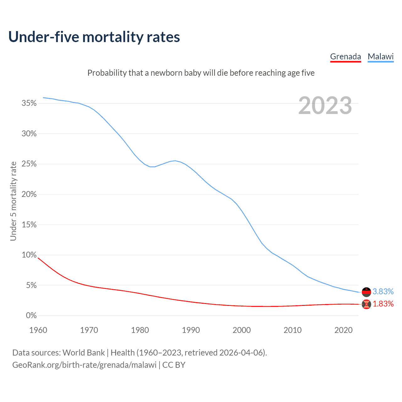 The chance that a newborn baby will die before reaching age five is 1.83% in Grenada and 3.83% in Malawi. Above is a chart with historical data on under-five mortality rates.