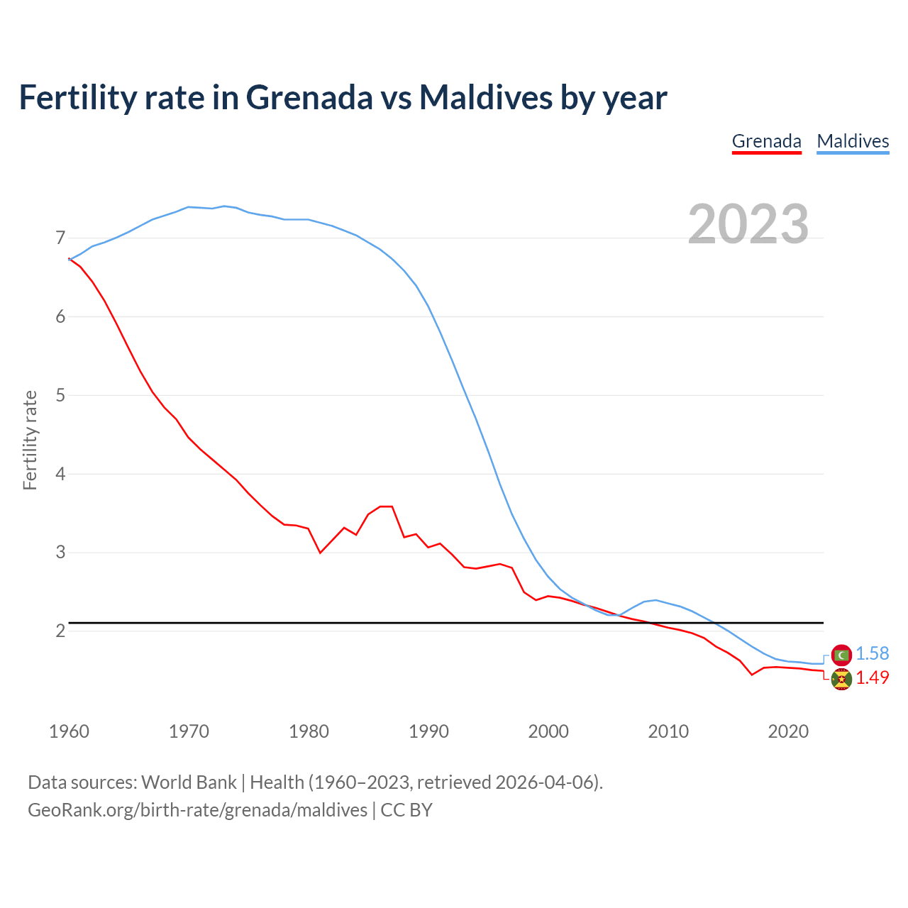 According to the latest available data on birth rates, the fertility rate in Grenada was 1.49 children per woman in 2023, compared to 1.58 in Maldives in 2023. The replacement level is considered to be 2.1 children per woman.
