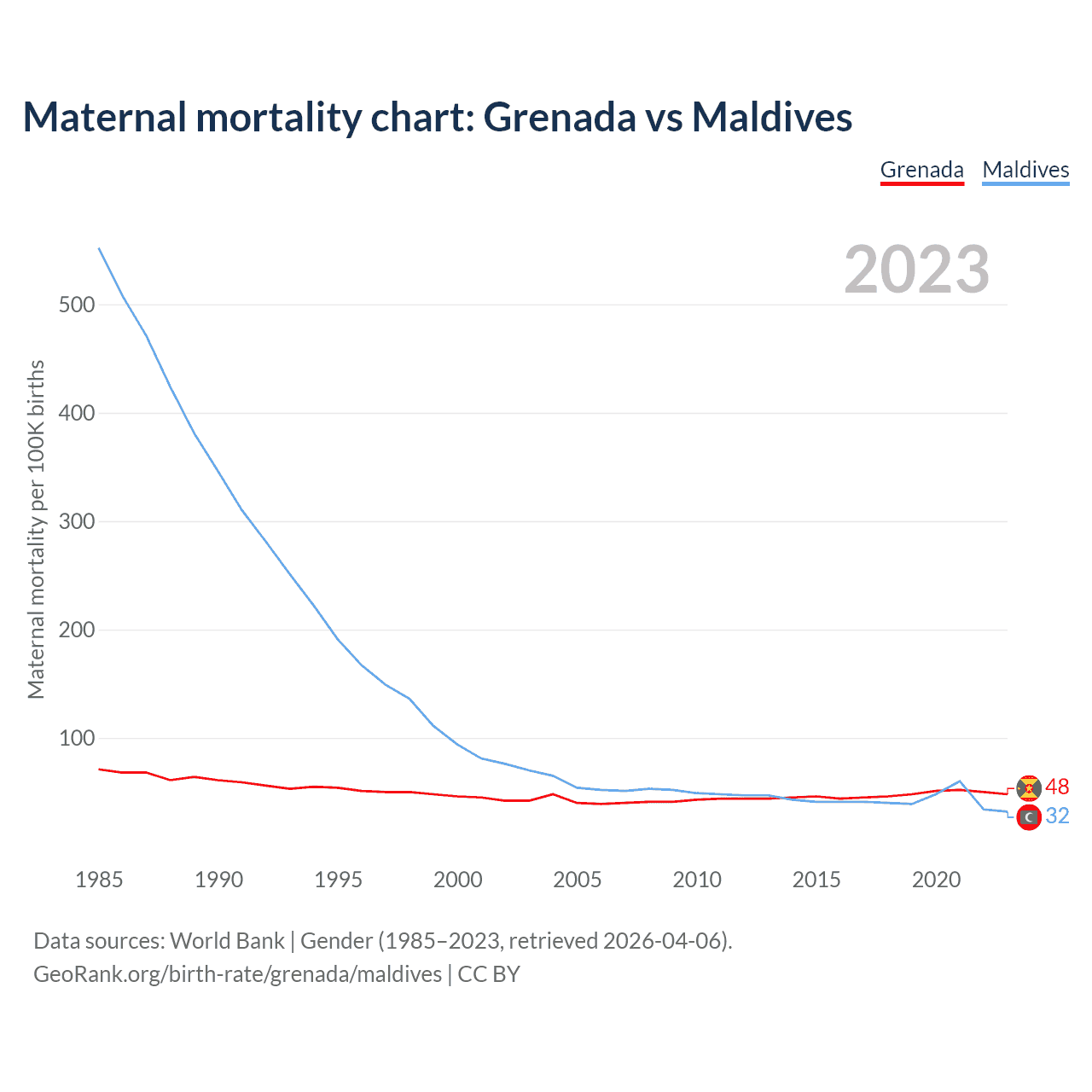 The maternal mortality rate, which is the probability of dying during childbirth or within 42 days of pregnancy termination, is 48 deaths per 100,000 live births in Grenada, compared to 32 deaths in Maldives.