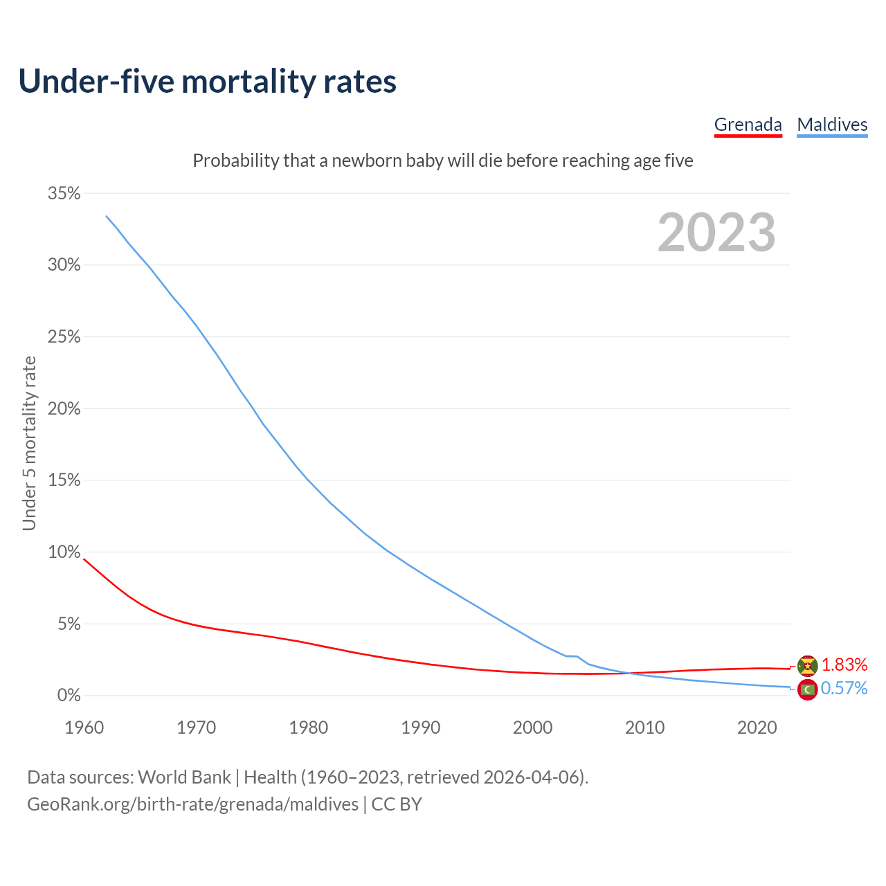 The chance that a newborn baby will die before reaching age five is 1.83% in Grenada and 0.57% in Maldives. Above is a chart with historical data on under-five mortality rates.