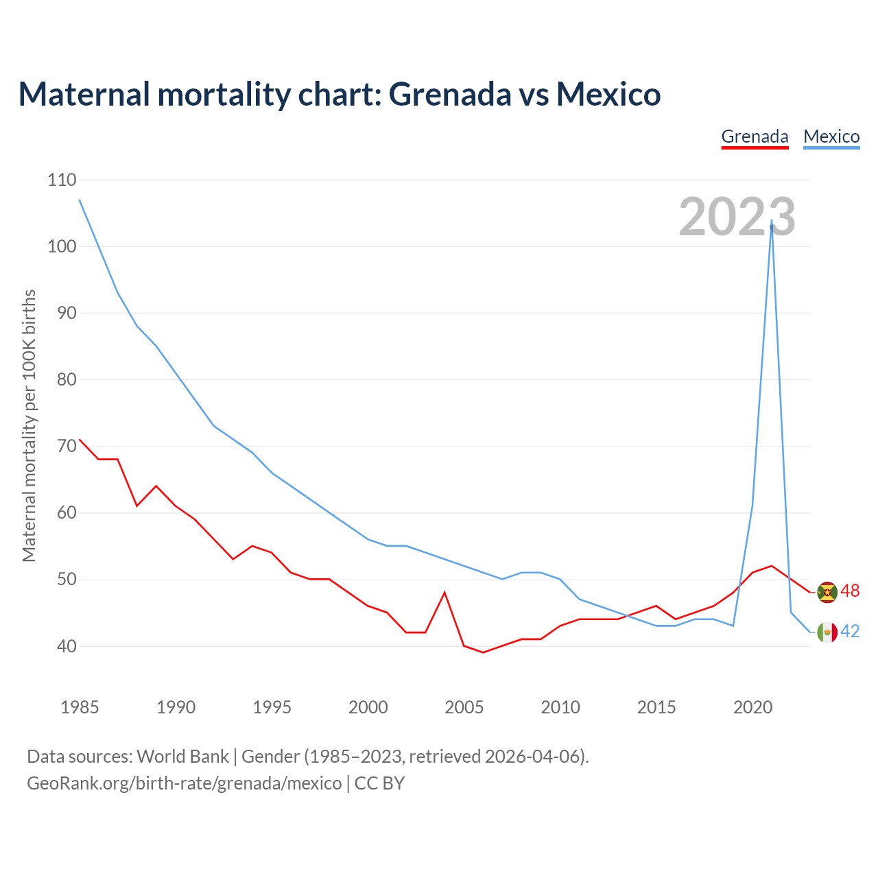 The maternal mortality rate, which is the probability of dying during childbirth or within 42 days of pregnancy termination, is 48 deaths per 100,000 live births in Grenada, compared to 42 deaths in Mexico.