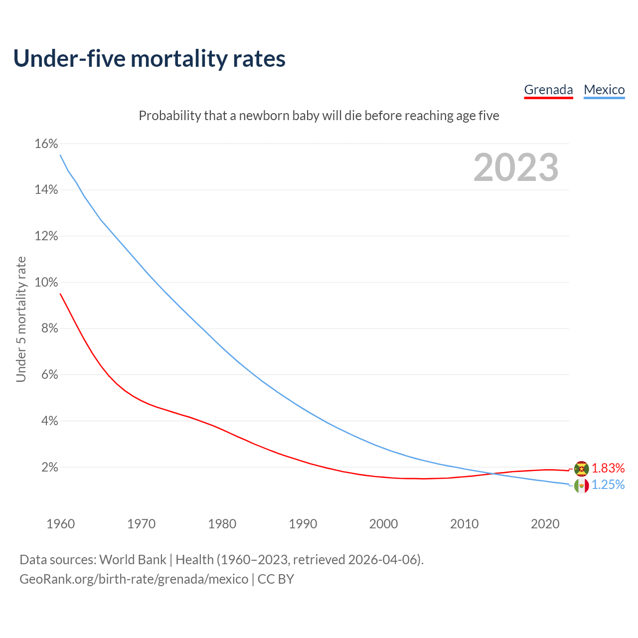 The chance that a newborn baby will die before reaching age five is 1.83% in Grenada and 1.25% in Mexico. Above is a chart with historical data on under-five mortality rates.