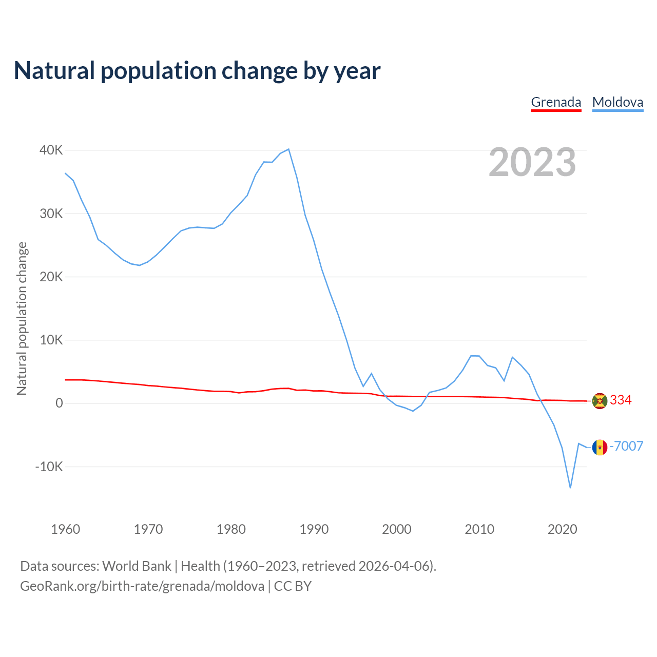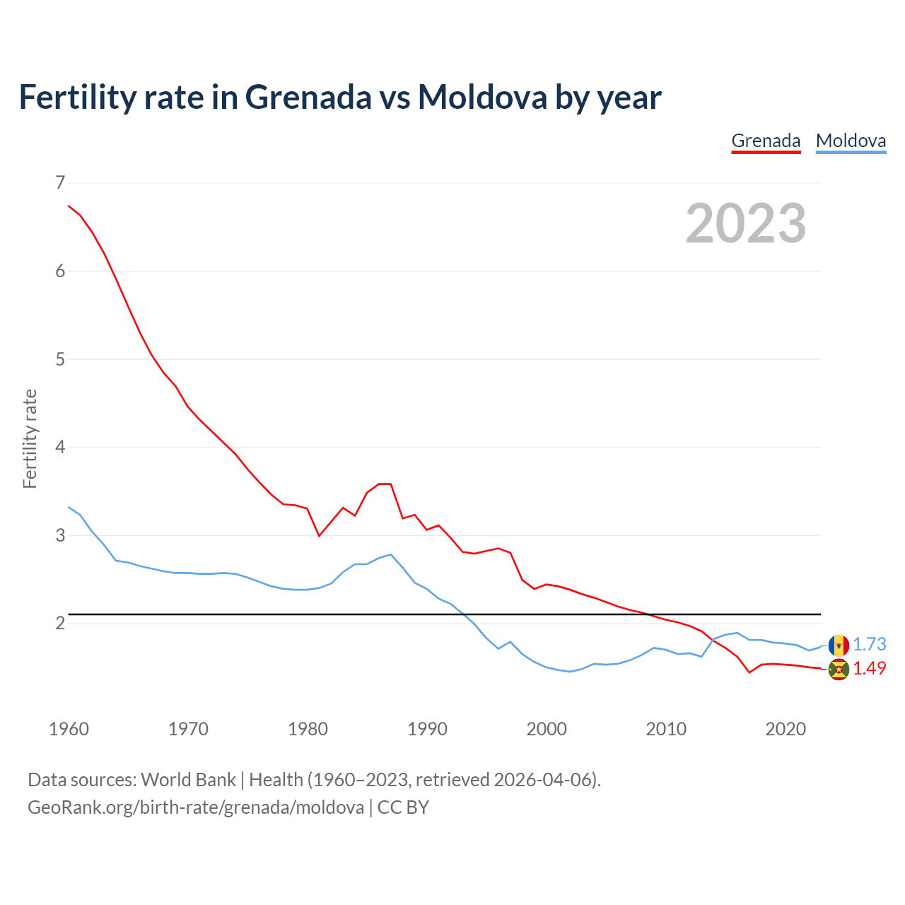 According to the latest available data on birth rates, the fertility rate in Grenada was 1.49 children per woman in 2023, compared to 1.73 in Moldova in 2023. The replacement level is considered to be 2.1 children per woman.