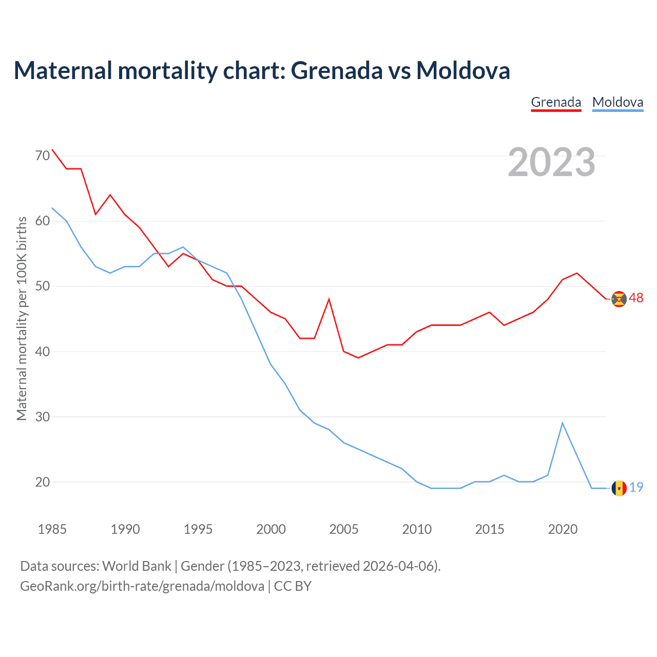 The maternal mortality rate, which is the probability of dying during childbirth or within 42 days of pregnancy termination, is 48 deaths per 100,000 live births in Grenada, compared to 19 deaths in Moldova.