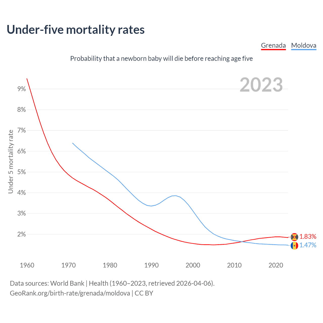 The chance that a newborn baby will die before reaching age five is 1.83% in Grenada and 1.47% in Moldova. Above is a chart with historical data on under-five mortality rates.