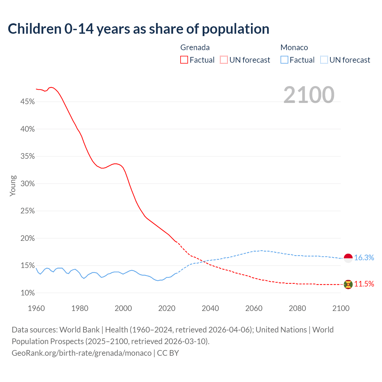 According to the latest available data on birth rates, the fertility rate in Grenada was 1.49 children per woman in 2023, compared to 2.11 in Monaco in 2023. The replacement level is considered to be 2.1 children per woman.