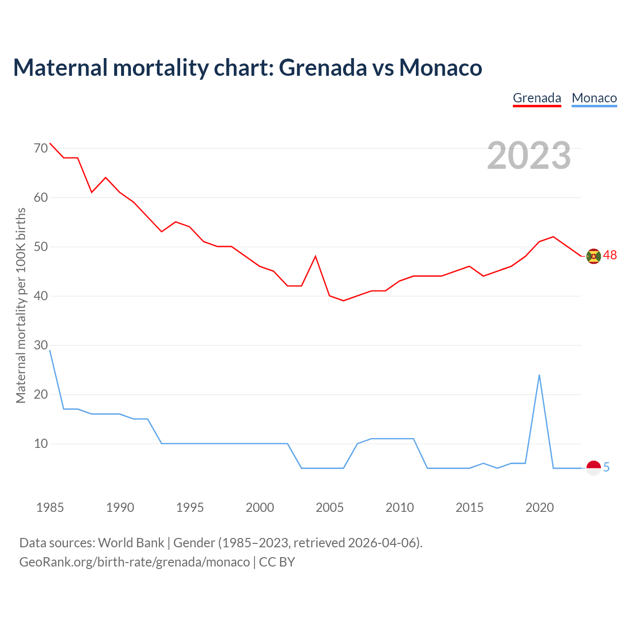 The maternal mortality rate, which is the probability of dying during childbirth or within 42 days of pregnancy termination, is 48 deaths per 100,000 live births in Grenada, compared to 5 deaths in Monaco.