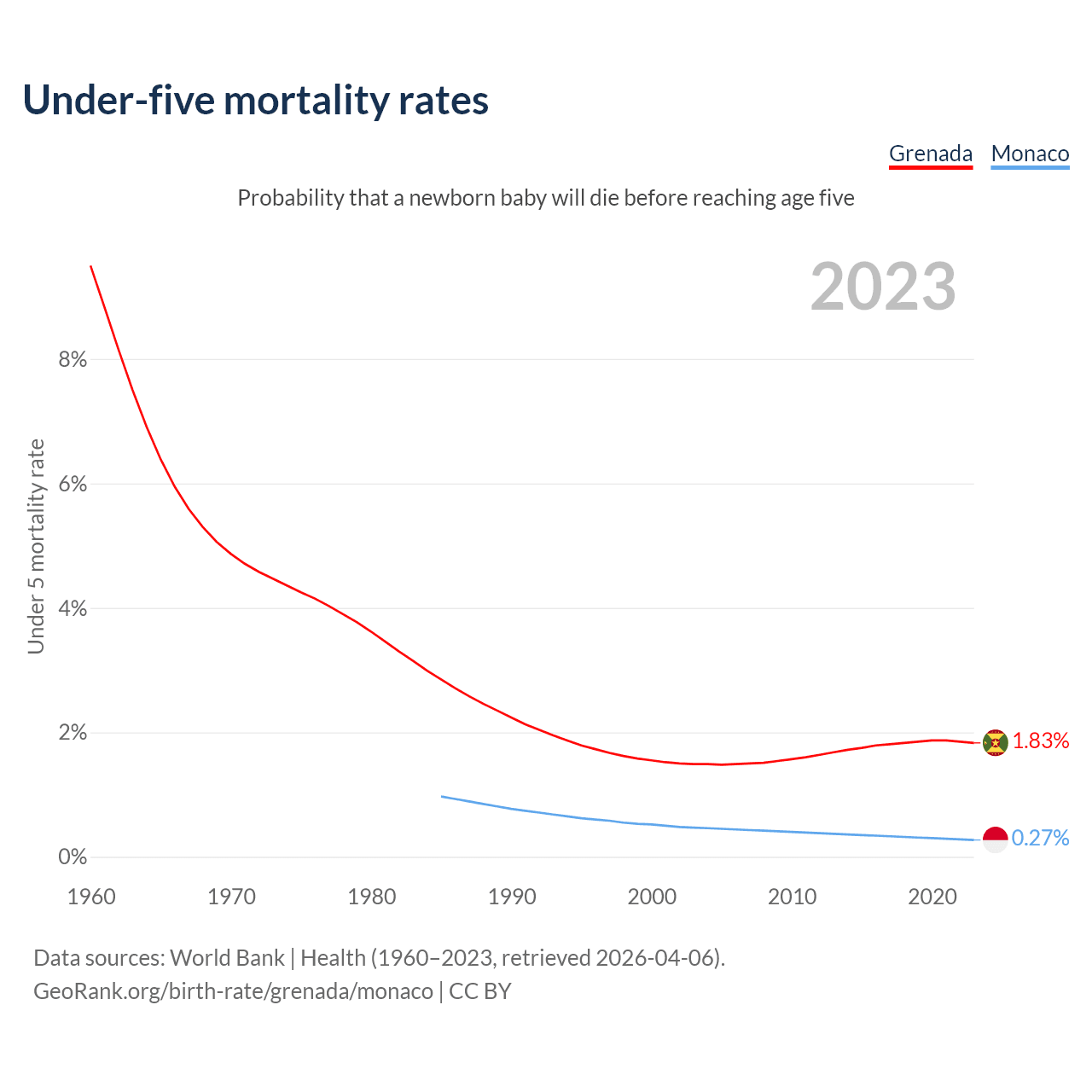 The chance that a newborn baby will die before reaching age five is 1.83% in Grenada and 0.27% in Monaco. Above is a chart with historical data on under-five mortality rates.