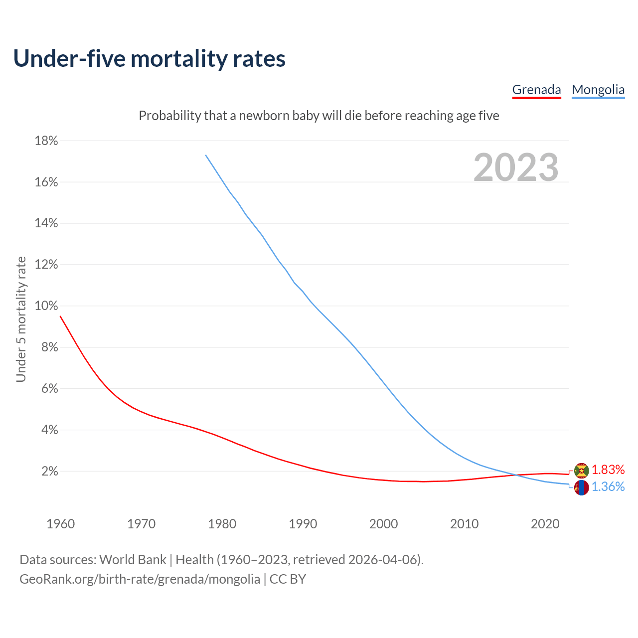 The chance that a newborn baby will die before reaching age five is 1.83% in Grenada and 1.36% in Mongolia. Above is a chart with historical data on under-five mortality rates.