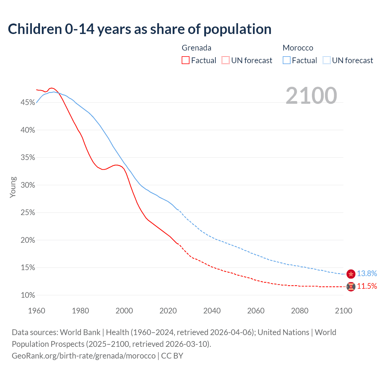 Grenada has an annual birth rate of 11.7 births per 1,000 people, compared to 16.7 for Morocco. The average number of children a woman is expected to have during her lifetime — the fertility rate, is 1.49 in Grenada and 2.23 in Morocco — 50% difference.