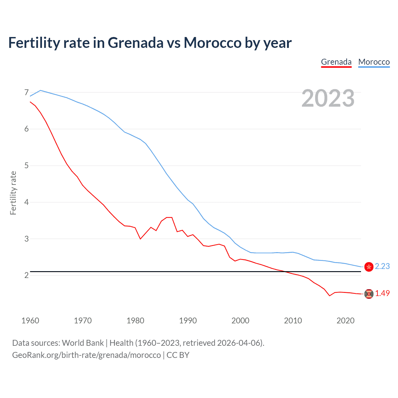 According to the latest available data on birth rates, the fertility rate in Grenada was 1.49 children per woman in 2023, compared to 2.23 in Morocco in 2023. The replacement level is considered to be 2.1 children per woman.