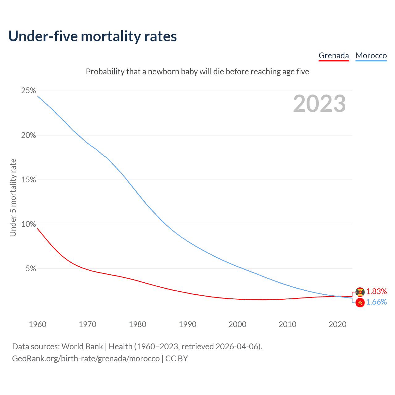 The chance that a newborn baby will die before reaching age five is 1.83% in Grenada and 1.66% in Morocco. Above is a chart with historical data on under-five mortality rates.