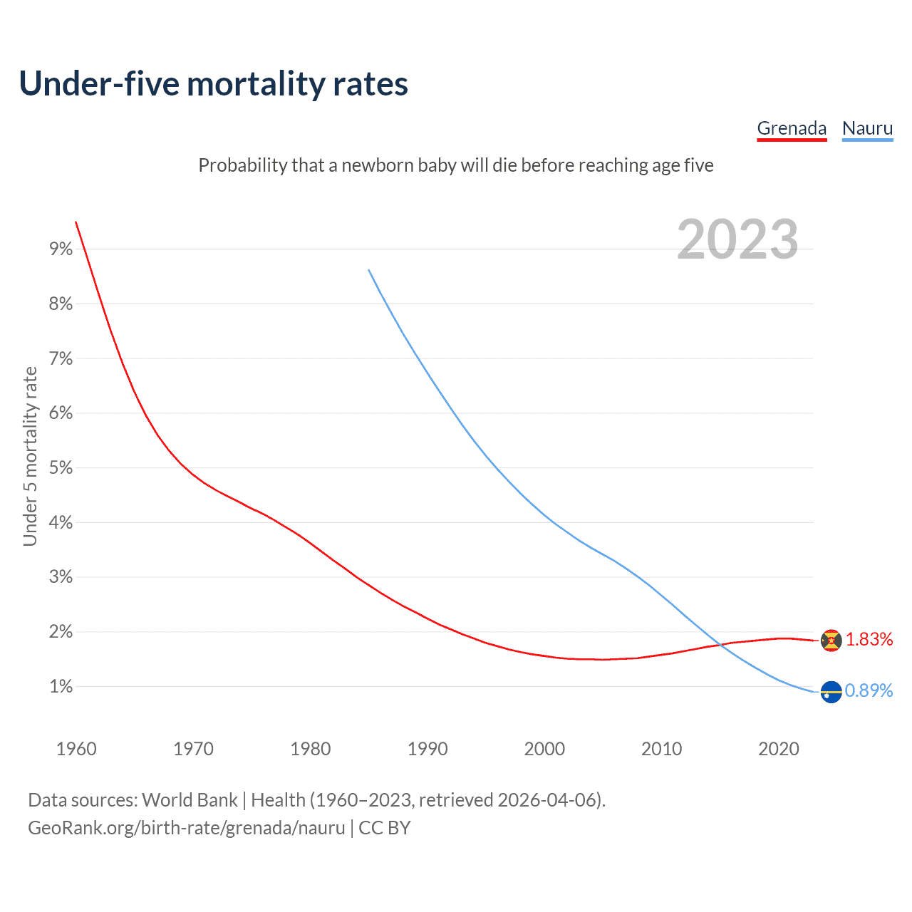 The chance that a newborn baby will die before reaching age five is 1.83% in Grenada and 0.89% in Nauru. Above is a chart with historical data on under-five mortality rates.