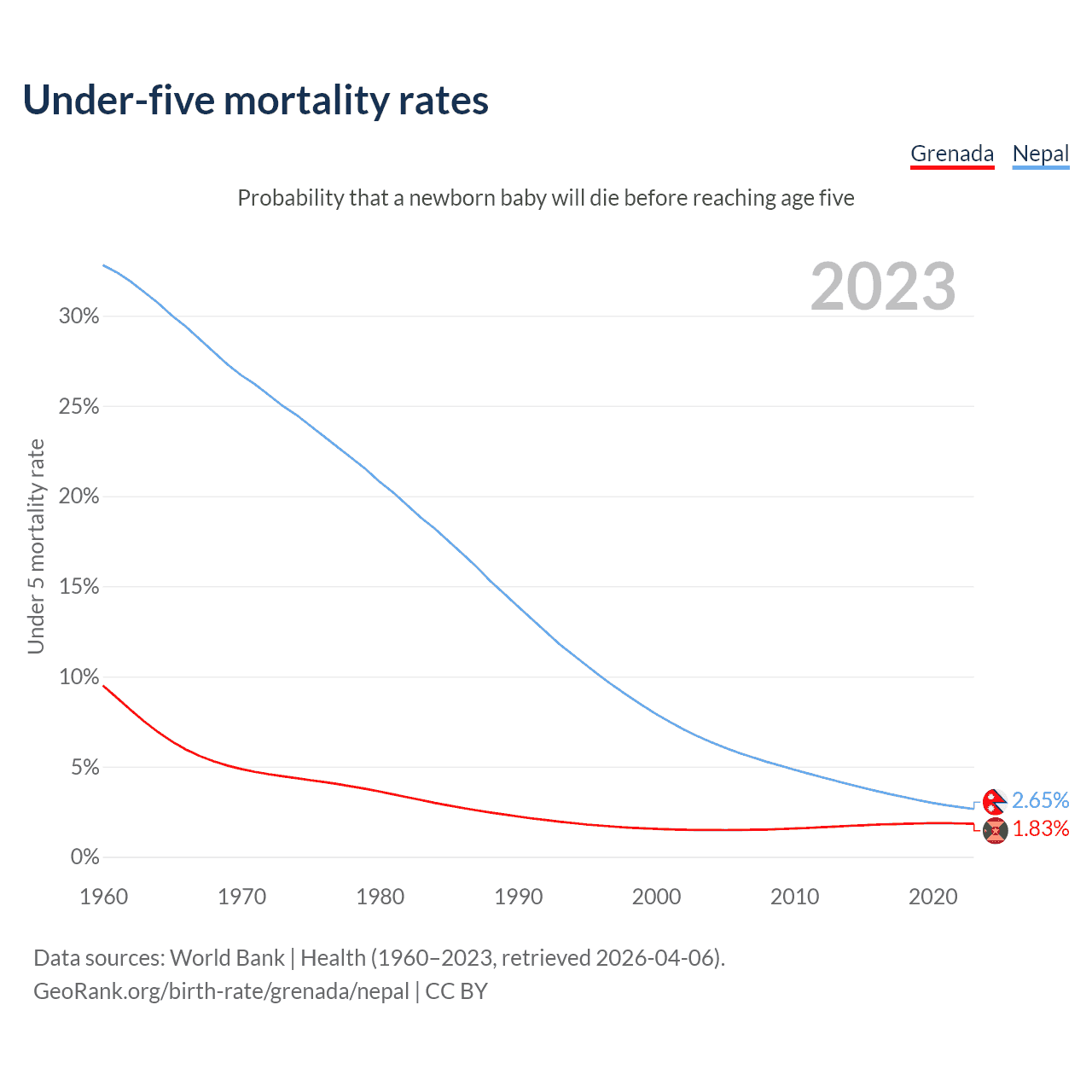 The chance that a newborn baby will die before reaching age five is 1.83% in Grenada and 2.65% in Nepal. Above is a chart with historical data on under-five mortality rates.