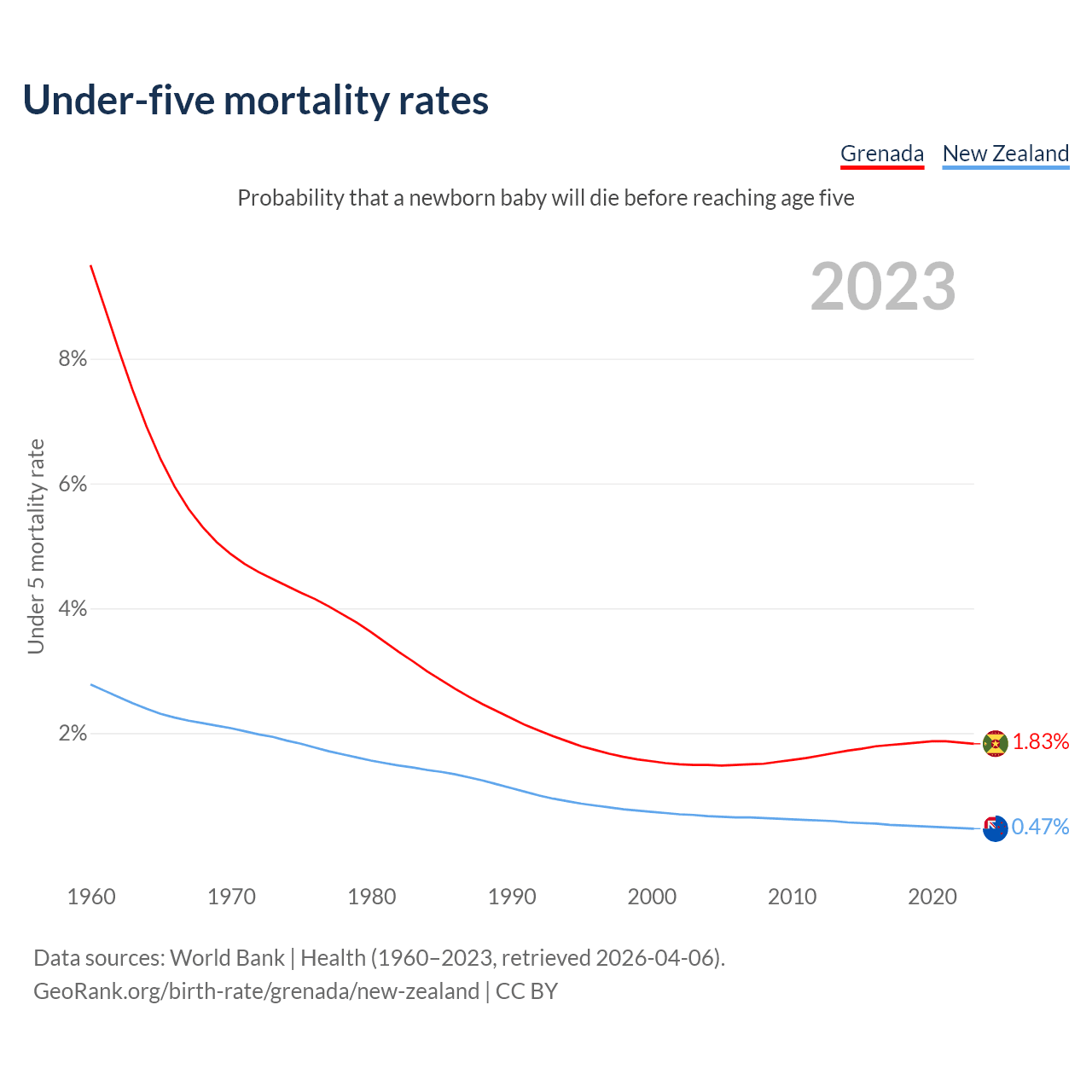 The chance that a newborn baby will die before reaching age five is 1.83% in Grenada and 0.47% in New Zealand. Above is a chart with historical data on under-five mortality rates.