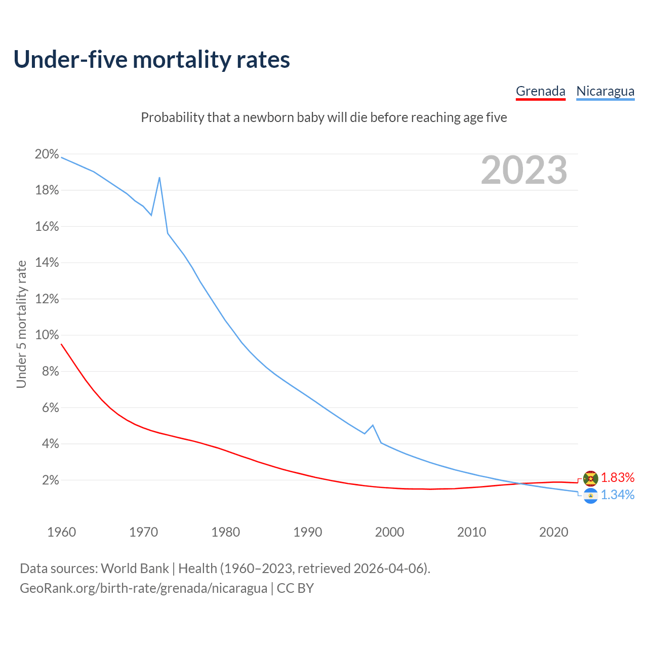 The chance that a newborn baby will die before reaching age five is 1.83% in Grenada and 1.34% in Nicaragua. Above is a chart with historical data on under-five mortality rates.