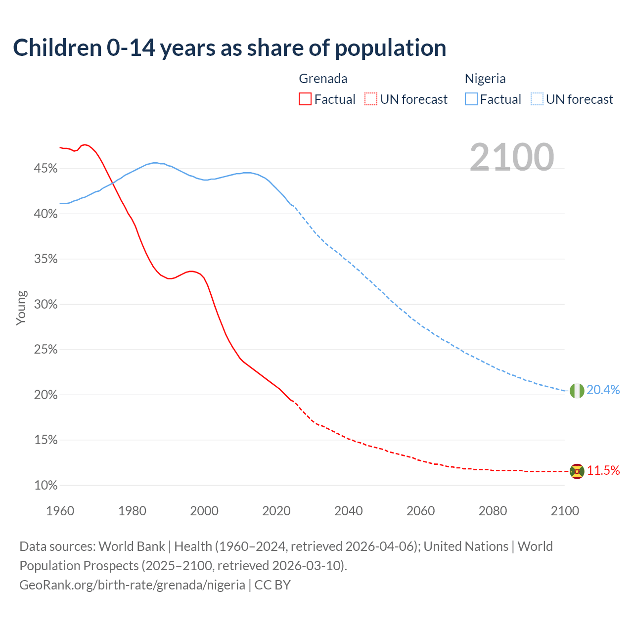 According to the latest available data on birth rates, the fertility rate in Grenada was 1.49 children per woman in 2023, compared to 4.48 in Nigeria in 2023. The replacement level is considered to be 2.1 children per woman.