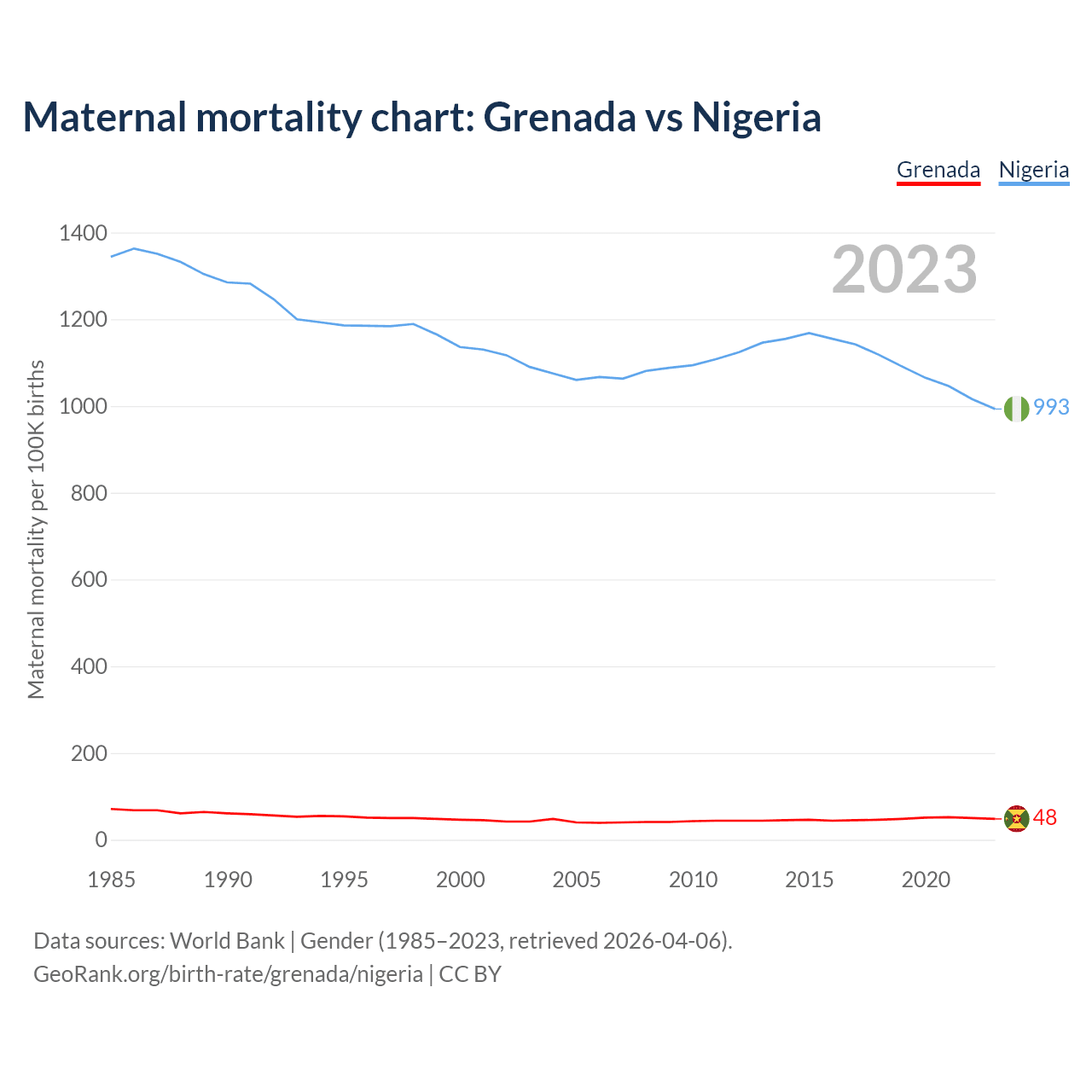 The maternal mortality rate, which is the probability of dying during childbirth or within 42 days of pregnancy termination, is 48 deaths per 100,000 live births in Grenada, compared to 993 deaths in Nigeria.