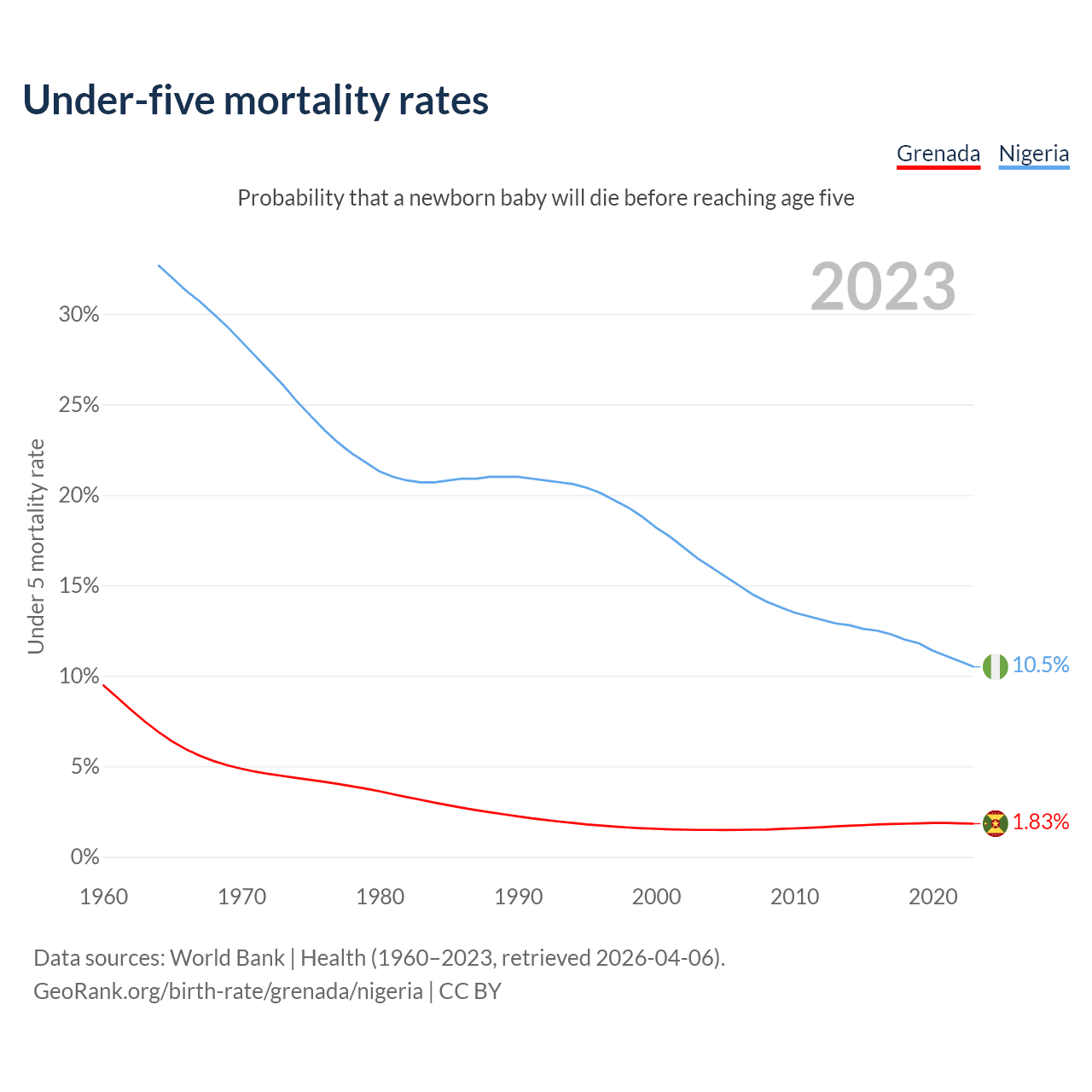 The chance that a newborn baby will die before reaching age five is 1.83% in Grenada and 10.5% in Nigeria. Above is a chart with historical data on under-five mortality rates.