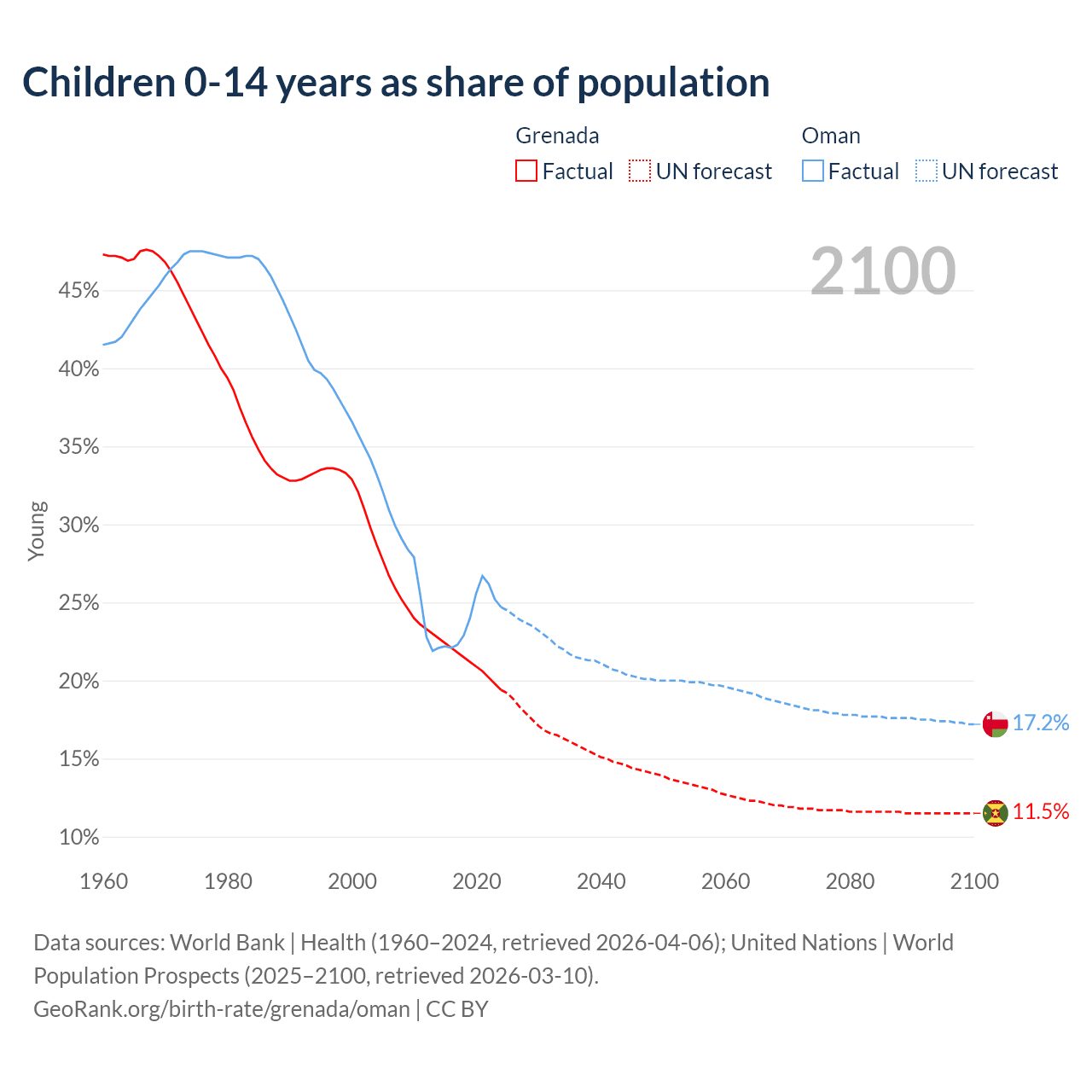 According to the latest available data on birth rates, the fertility rate in Grenada was 1.49 children per woman in 2023, compared to 2.53 in Oman in 2023. The replacement level is considered to be 2.1 children per woman.