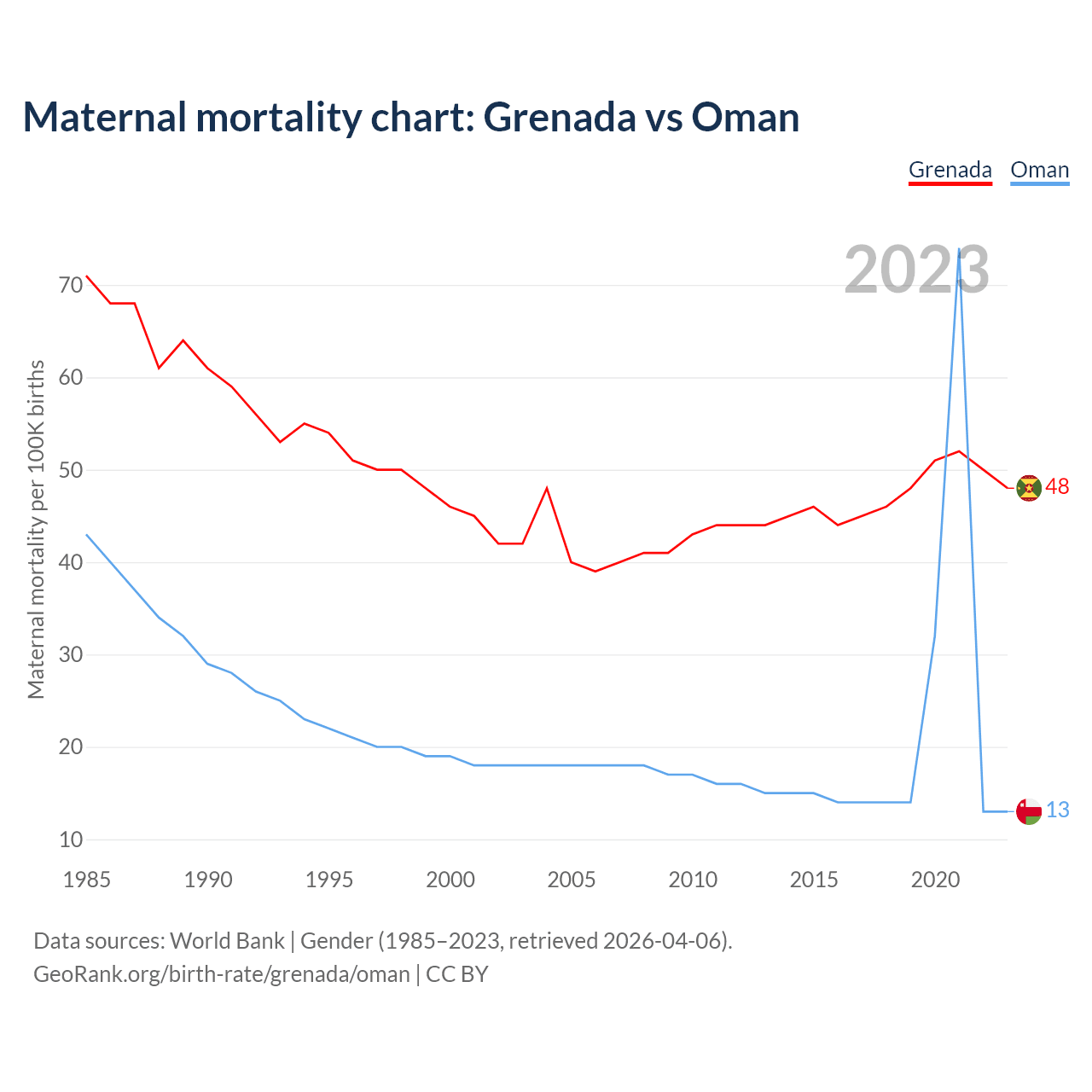 The maternal mortality rate, which is the probability of dying during childbirth or within 42 days of pregnancy termination, is 48 deaths per 100,000 live births in Grenada, compared to 13 deaths in Oman.