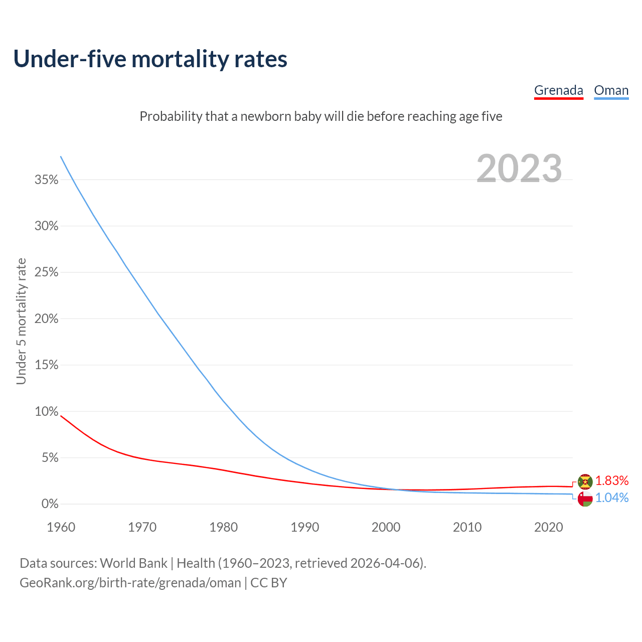 The chance that a newborn baby will die before reaching age five is 1.83% in Grenada and 1.04% in Oman. Above is a chart with historical data on under-five mortality rates.