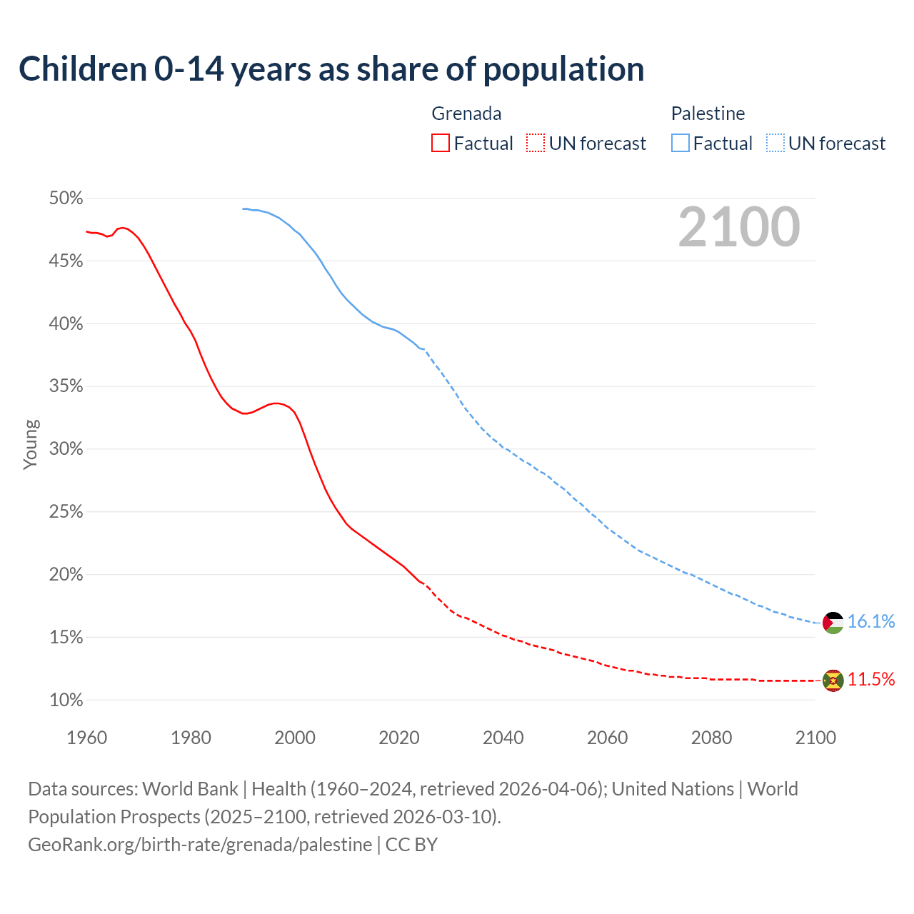 According to the latest available data on birth rates, the fertility rate in Grenada was 1.49 children per woman in 2023, compared to 3.31 in Palestine in 2023. The replacement level is considered to be 2.1 children per woman.