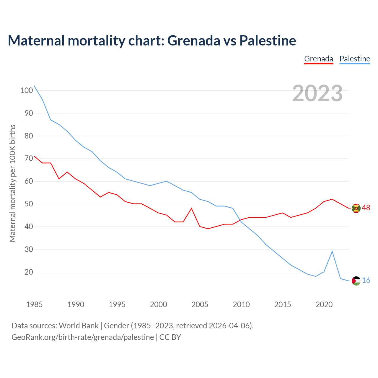 The maternal mortality rate, which is the probability of dying during childbirth or within 42 days of pregnancy termination, is 48 deaths per 100,000 live births in Grenada, compared to 16 deaths in Palestine.