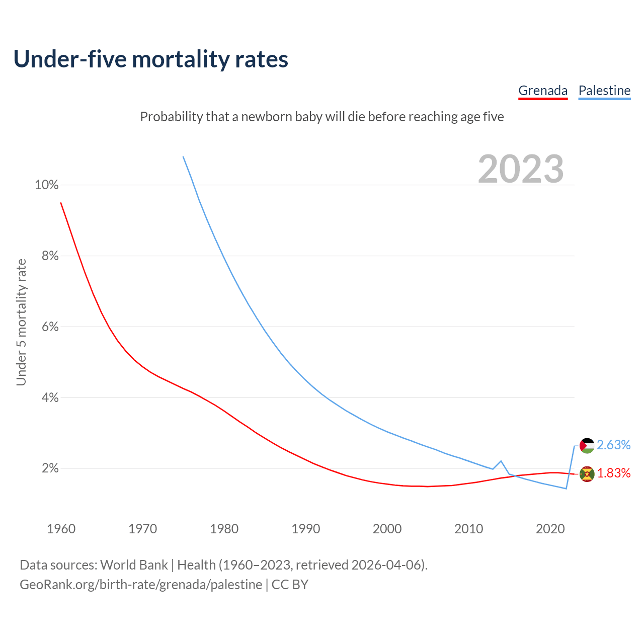 The chance that a newborn baby will die before reaching age five is 1.83% in Grenada and 2.63% in Palestine. Above is a chart with historical data on under-five mortality rates.