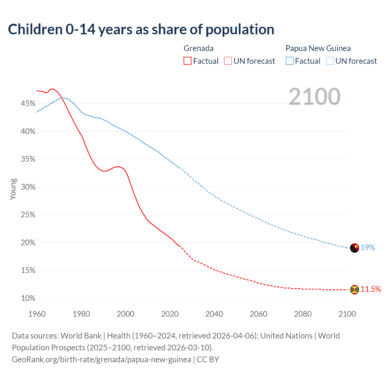 According to the latest available data on birth rates, the fertility rate in Grenada was 1.49 children per woman in 2023, compared to 3.1 in Papua New Guinea in 2023. The replacement level is considered to be 2.1 children per woman.
