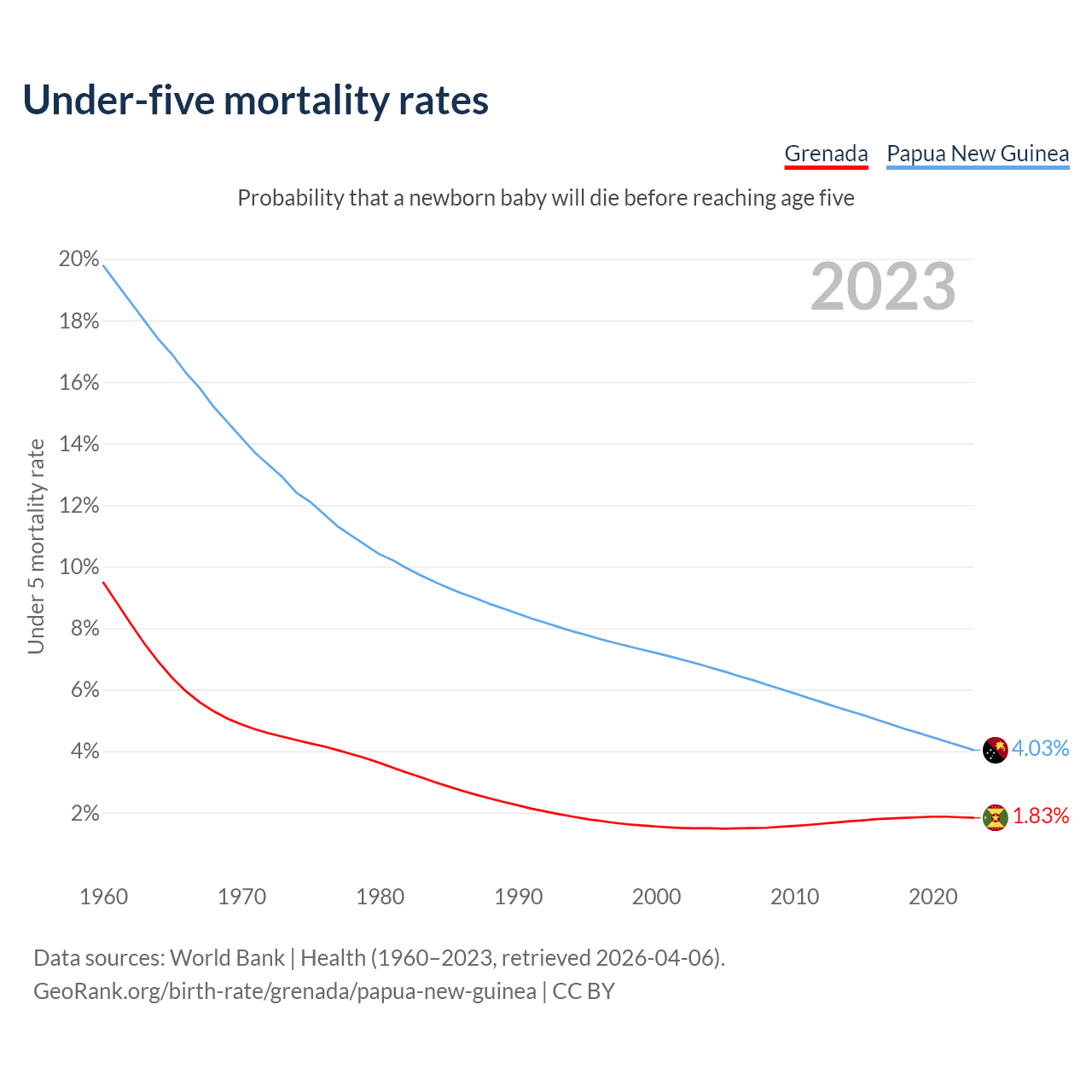 The chance that a newborn baby will die before reaching age five is 1.83% in Grenada and 4.03% in Papua New Guinea. Above is a chart with historical data on under-five mortality rates.