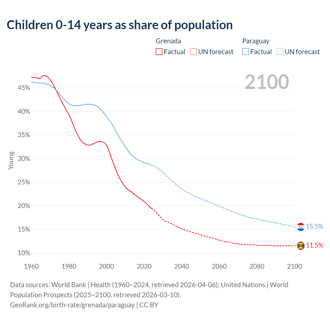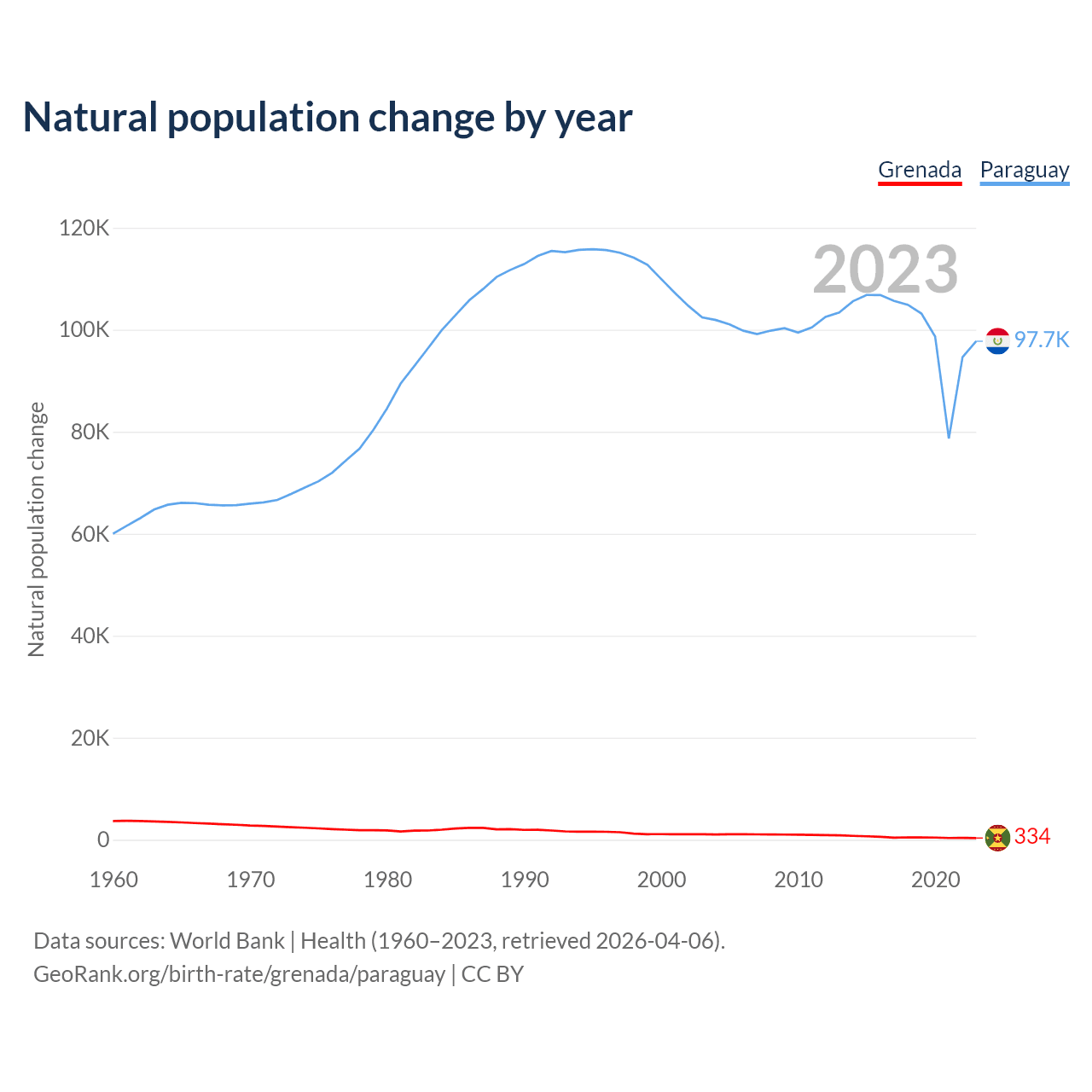 According to the latest available data on birth rates, the fertility rate in Grenada was 1.49 children per woman in 2023, compared to 2.42 in Paraguay in 2023. The replacement level is considered to be 2.1 children per woman.