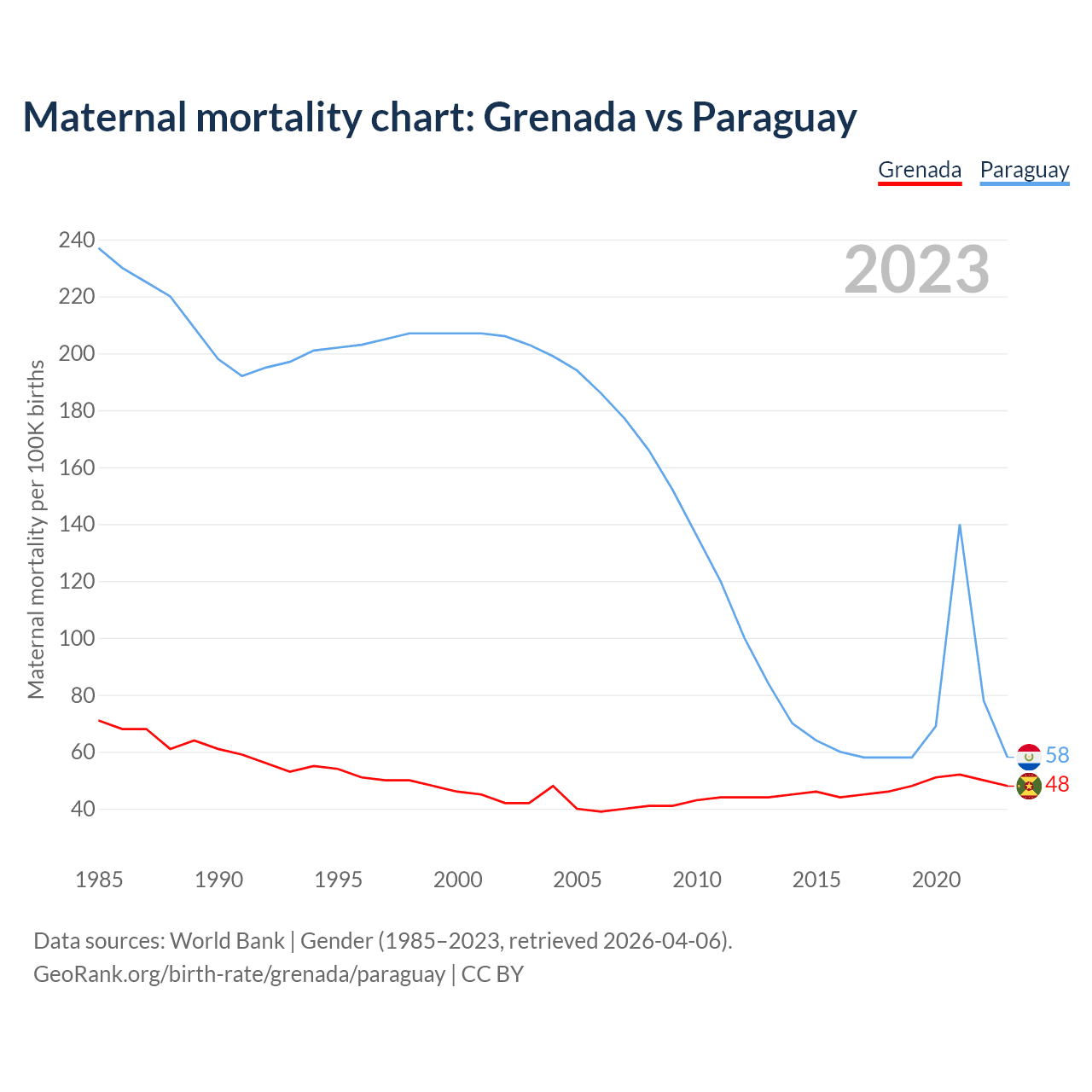 The maternal mortality rate, which is the probability of dying during childbirth or within 42 days of pregnancy termination, is 48 deaths per 100,000 live births in Grenada, compared to 58 deaths in Paraguay.