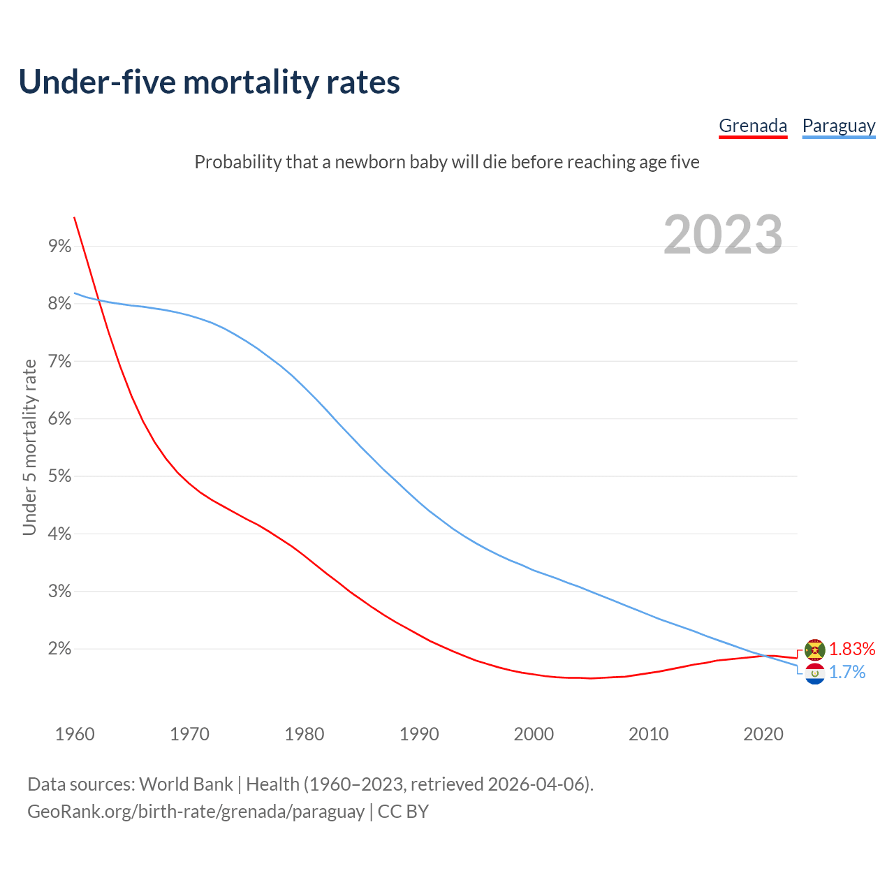 The chance that a newborn baby will die before reaching age five is 1.83% in Grenada and 1.7% in Paraguay. Above is a chart with historical data on under-five mortality rates.